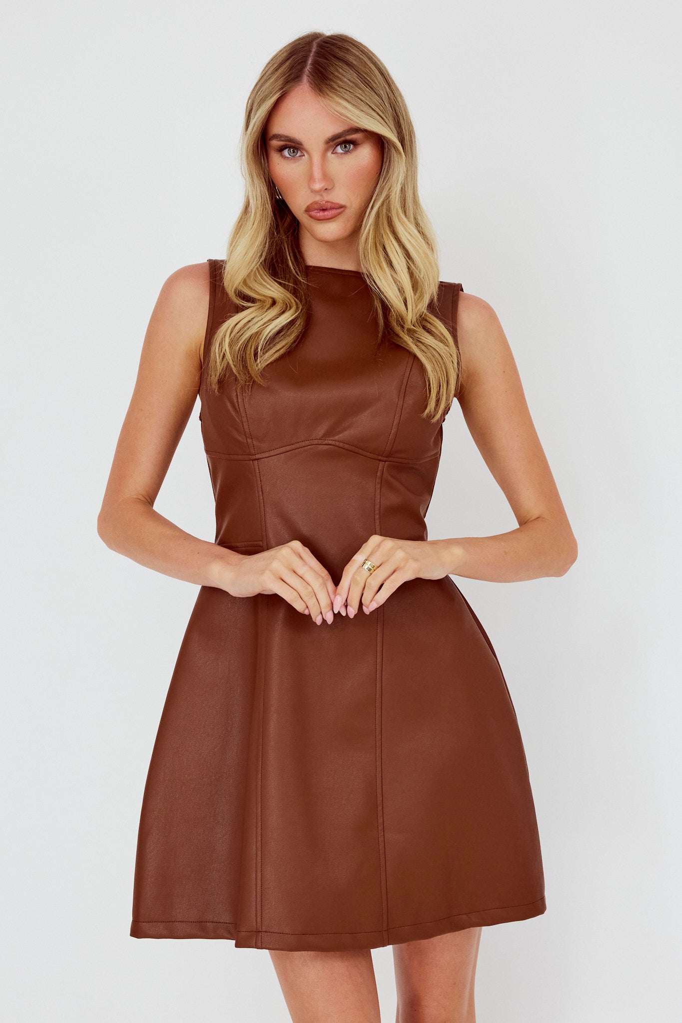 Opulent Sleeveless A-Line Mini Dress Faux Leather Brown