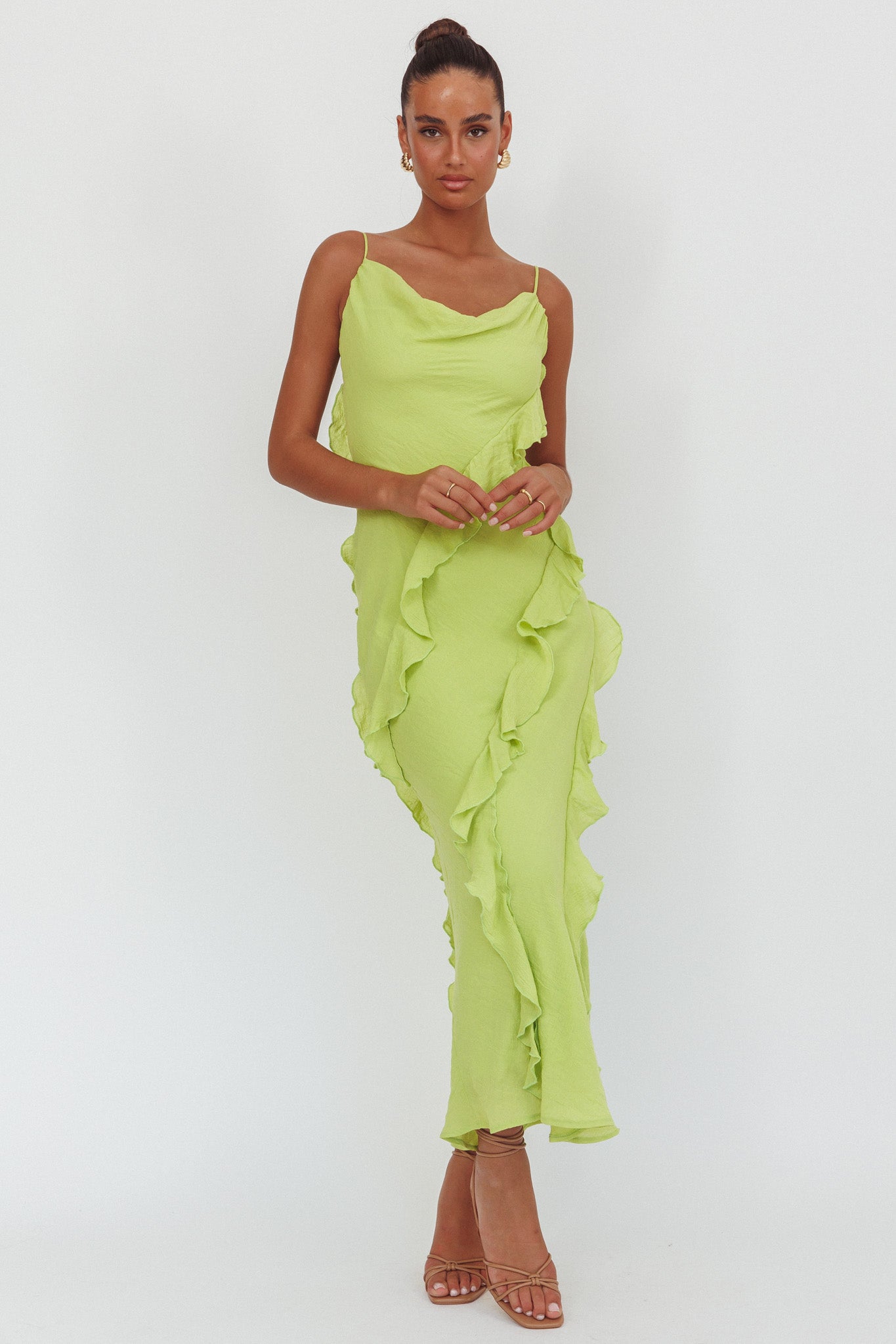 Panama Bay Ruffle Trim Cowl Neck Maxi Dress Sage