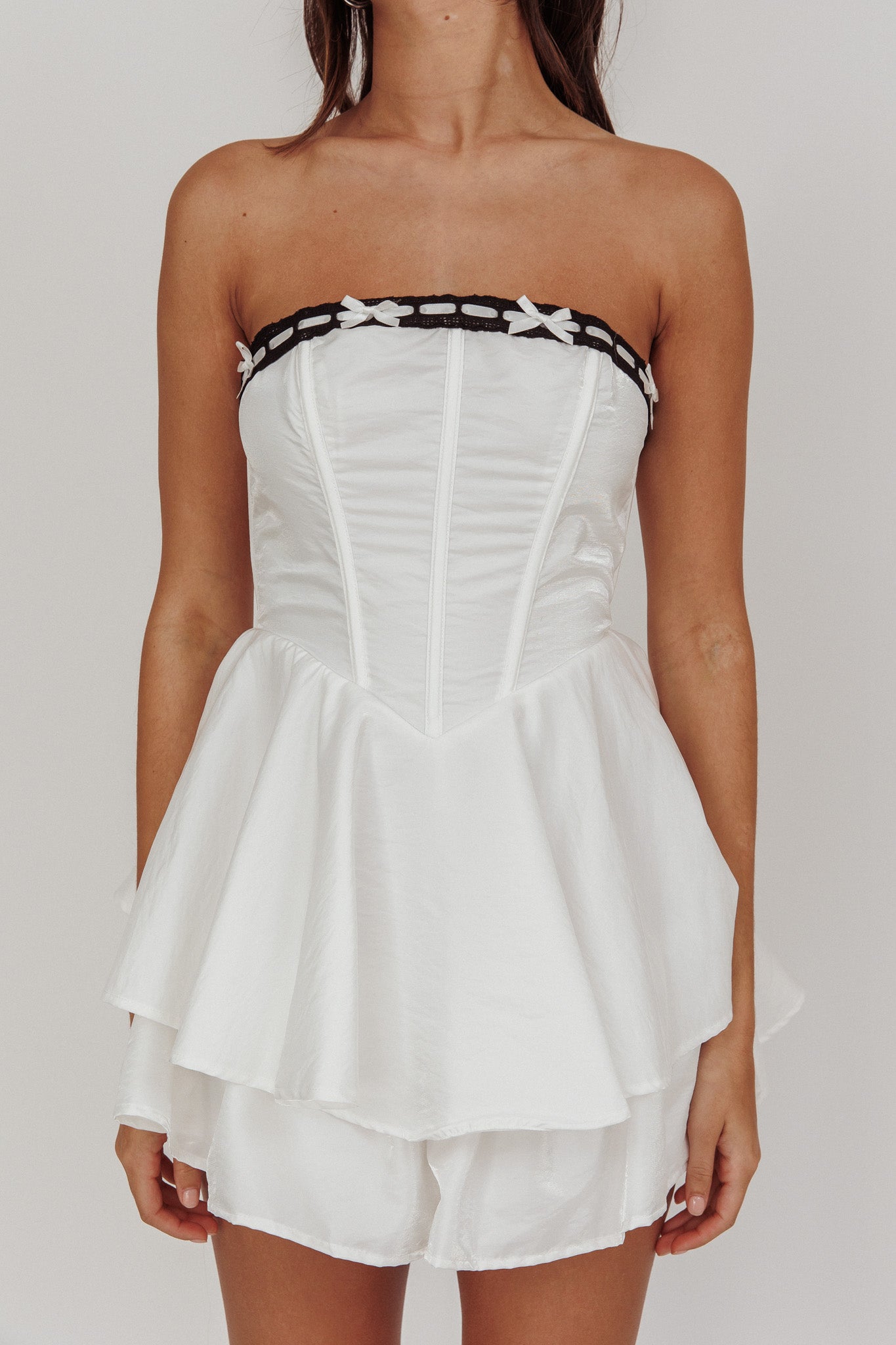 Steal the show in our gorgeous Paris Muse romper. We are obsessed with its adorable lace and bow trim in the neckline. It's the perfect choice for a birthday party or special occasion. Team it with nude, strappy heels and a mini purse for a look we are loving.