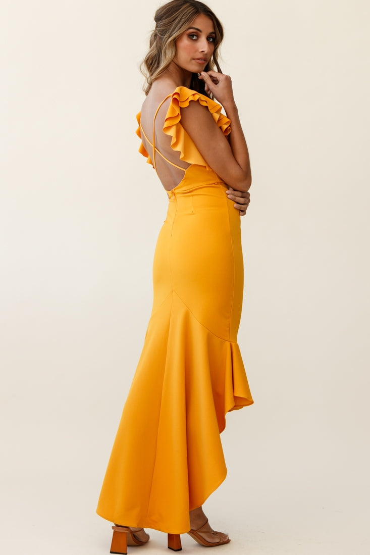 Pearl Ruffle Strap High-Low Hem Dress Mustard