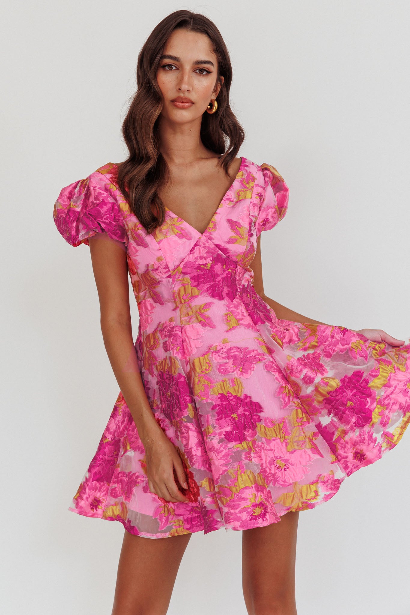 Twirl through the weekend in our Perfect Match mini dress. It features a gorgeous floral design and romantic puff sleeves. It's just what you need for a flirty dinner with your lover. Team it with strappy, tied heels and a tote for an unforgettable look.
