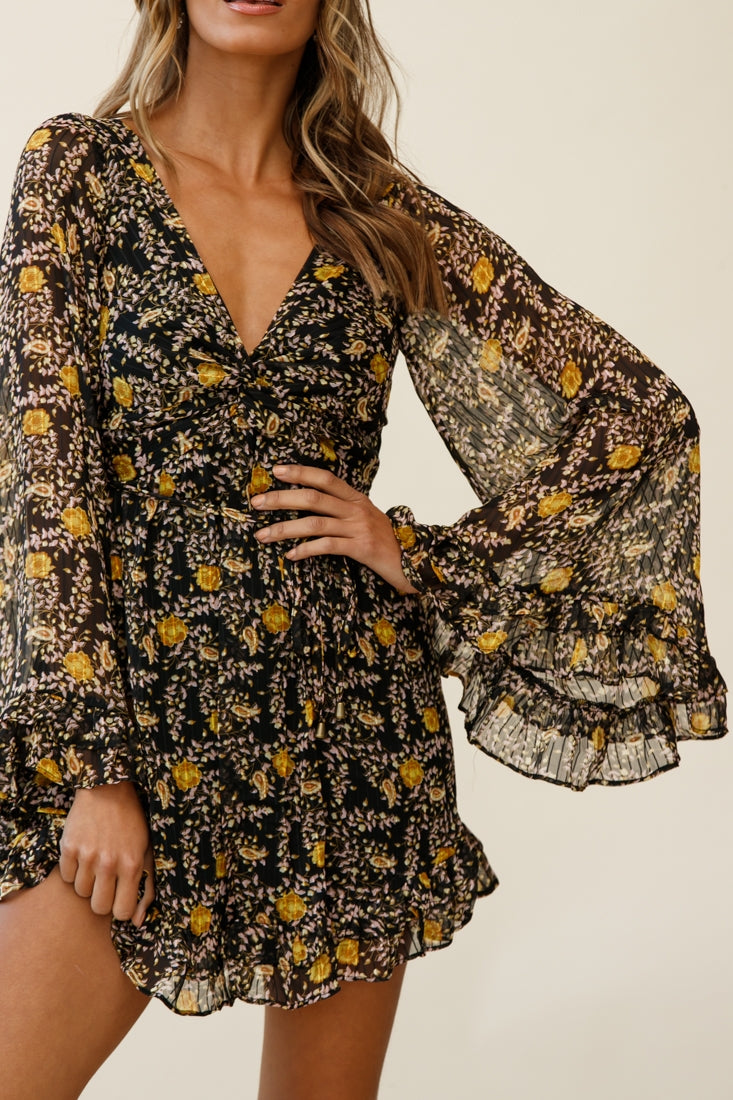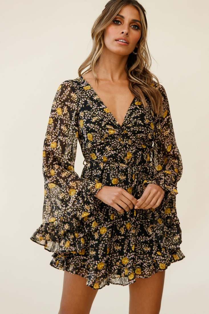 Channel your inner 70's babe with our pretty Perri dress. Featuring long, bell sleeves, twisted knot bust detail and waist tie with golden stoppers. Perfect for a night out dancing teamed with knee-high boots for a super cute look.
