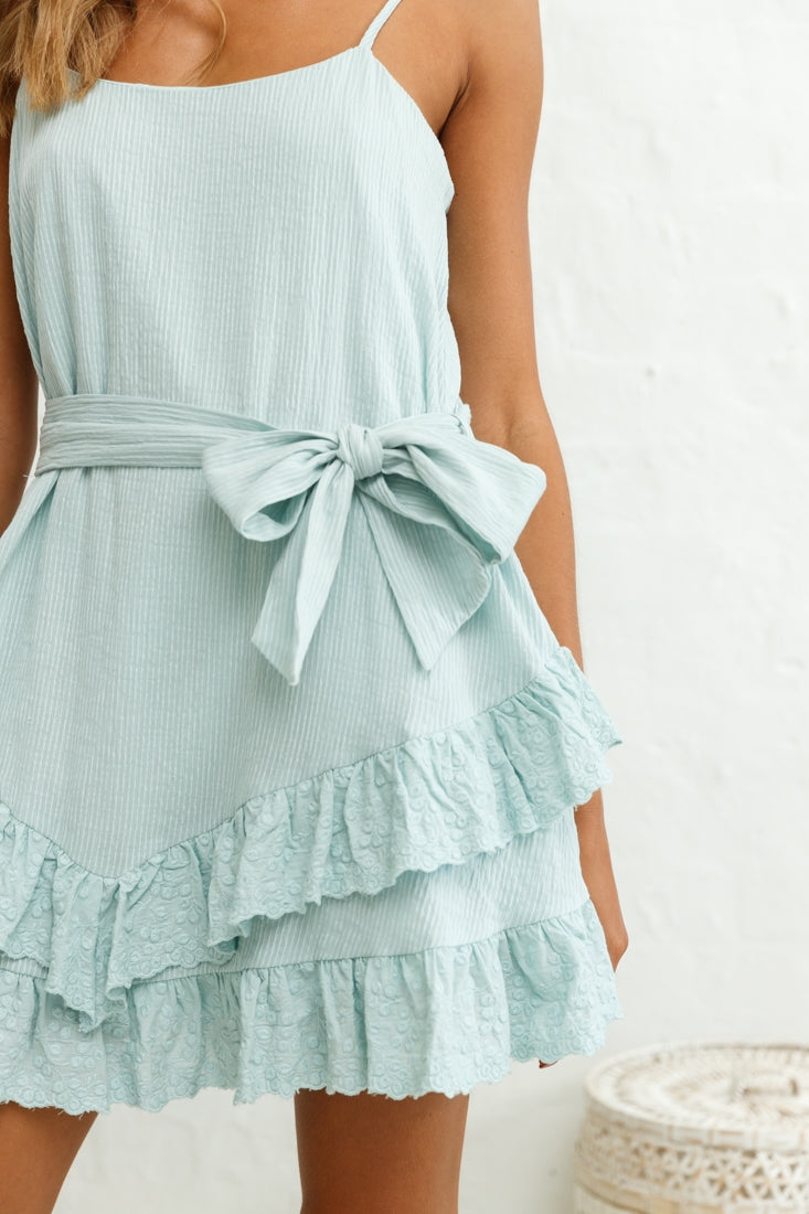 Hey there, cutie! You are stealing the show in our super cute Petrie dress. Fully lined, it features a double, layered ruffle hemline, adjustable cami straps, separate waist tie and invisible zipper up the back. Perfect for a girls' day out teamed with tennis shoes and a woven circle bag.