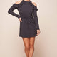 The ruffled detail around the exposed shoulders is a the elegant touch you need for a cozy little dress like this one! Ribbed knit fabric is the perfect solution for staying warm.