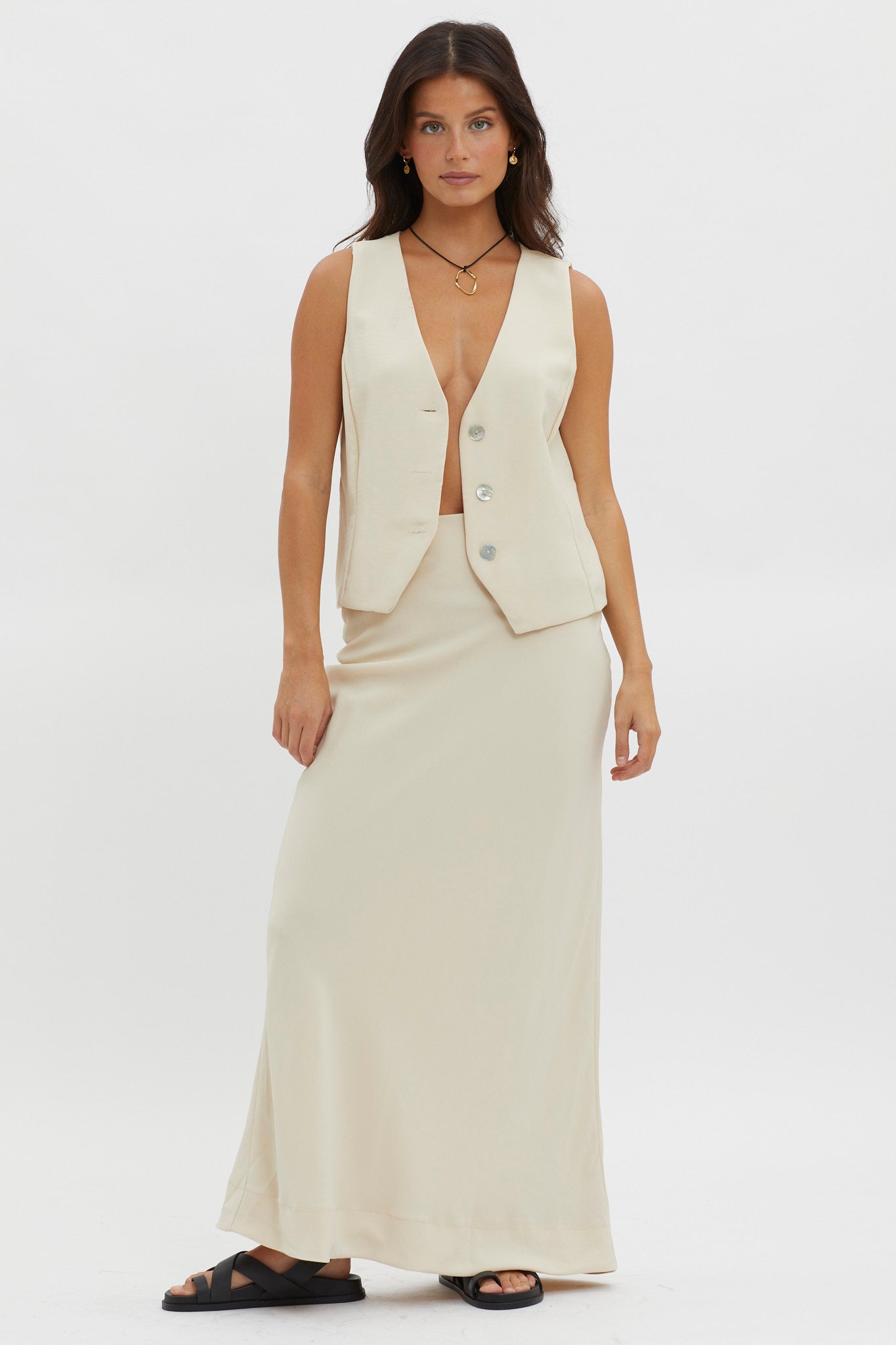 You'll go straight to the best-dressed list in our on-trend Philomena vest. Featuring a sleeveless style and a button closure, it's perfect for your 9-5 or dinner with your girls. Team it with its matching midi skirt and kitten heels for a look that will turn heads.
