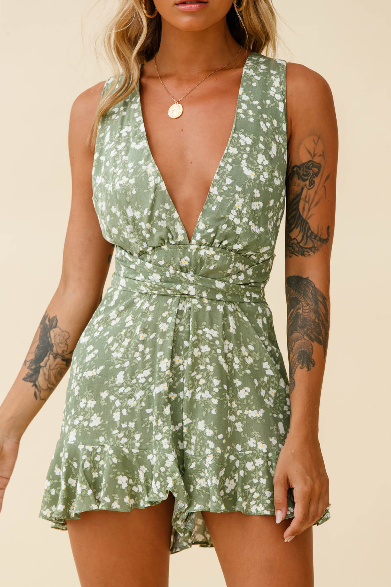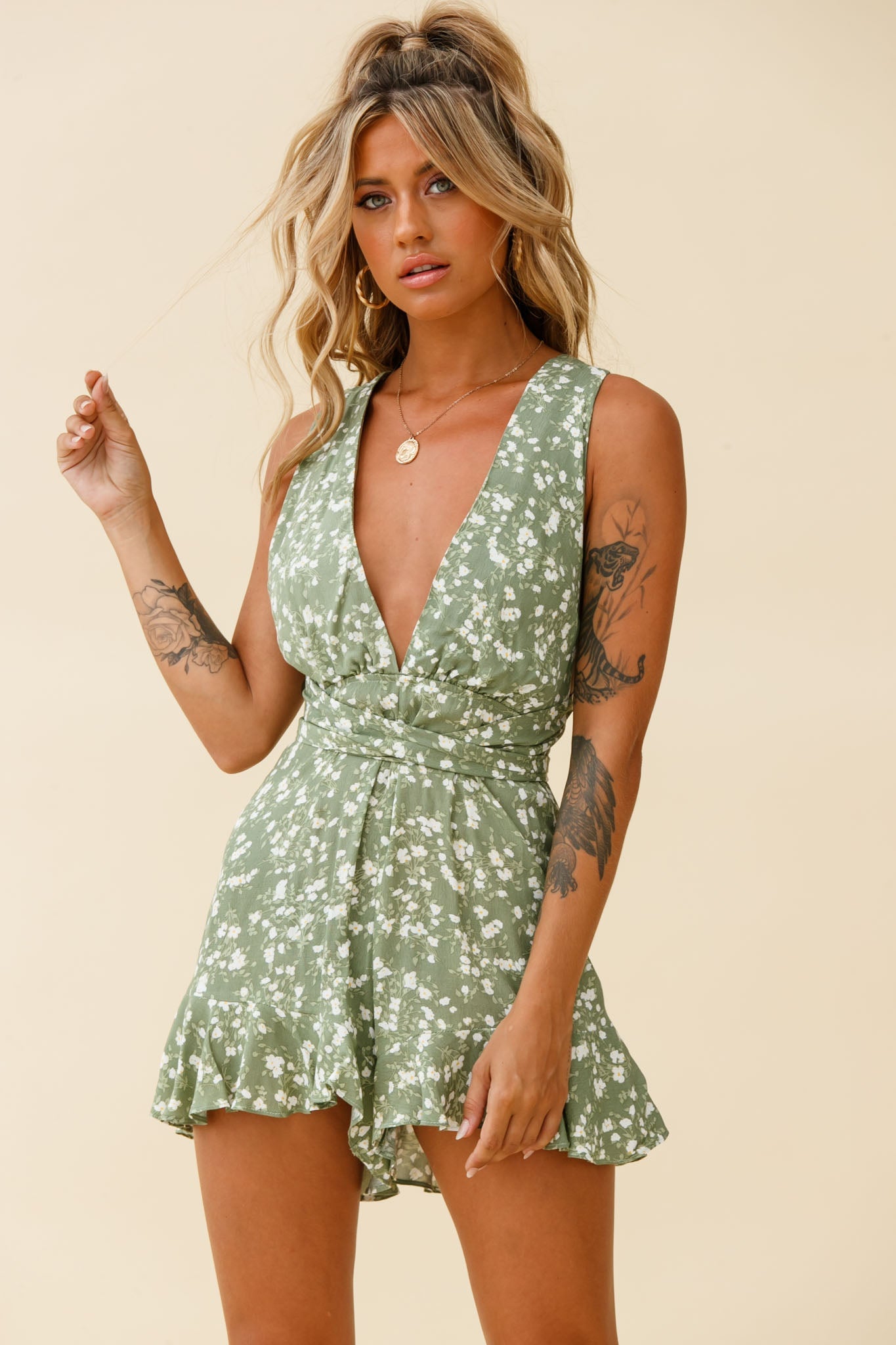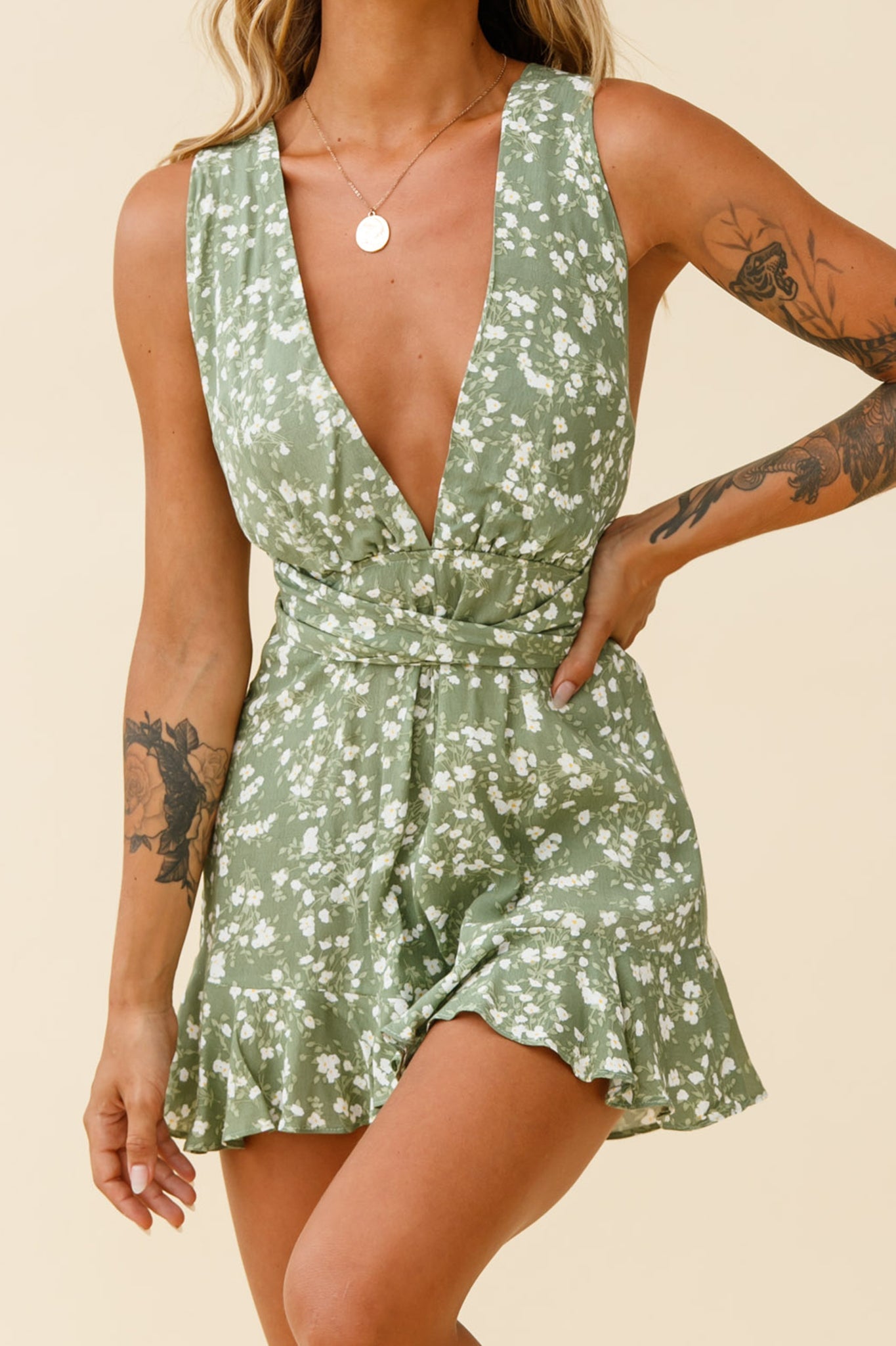 Playa Vista Halterneck Frill Hem Romper Floral Print Olive