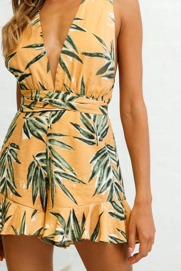 You'll feel like hopping aboard the next flight to Mexico in this sweet and Summery romper. Fully lined, it features a halterneck style neck, open back and frill hem. We are loving the gorgeous palm-leaf print, upping it's tropi-cool factor. Team it with wedges and a mojito.
