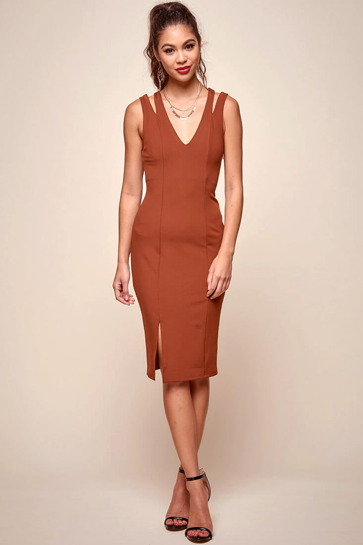 Pope Double Strap Bodycon Midi Dress Brown