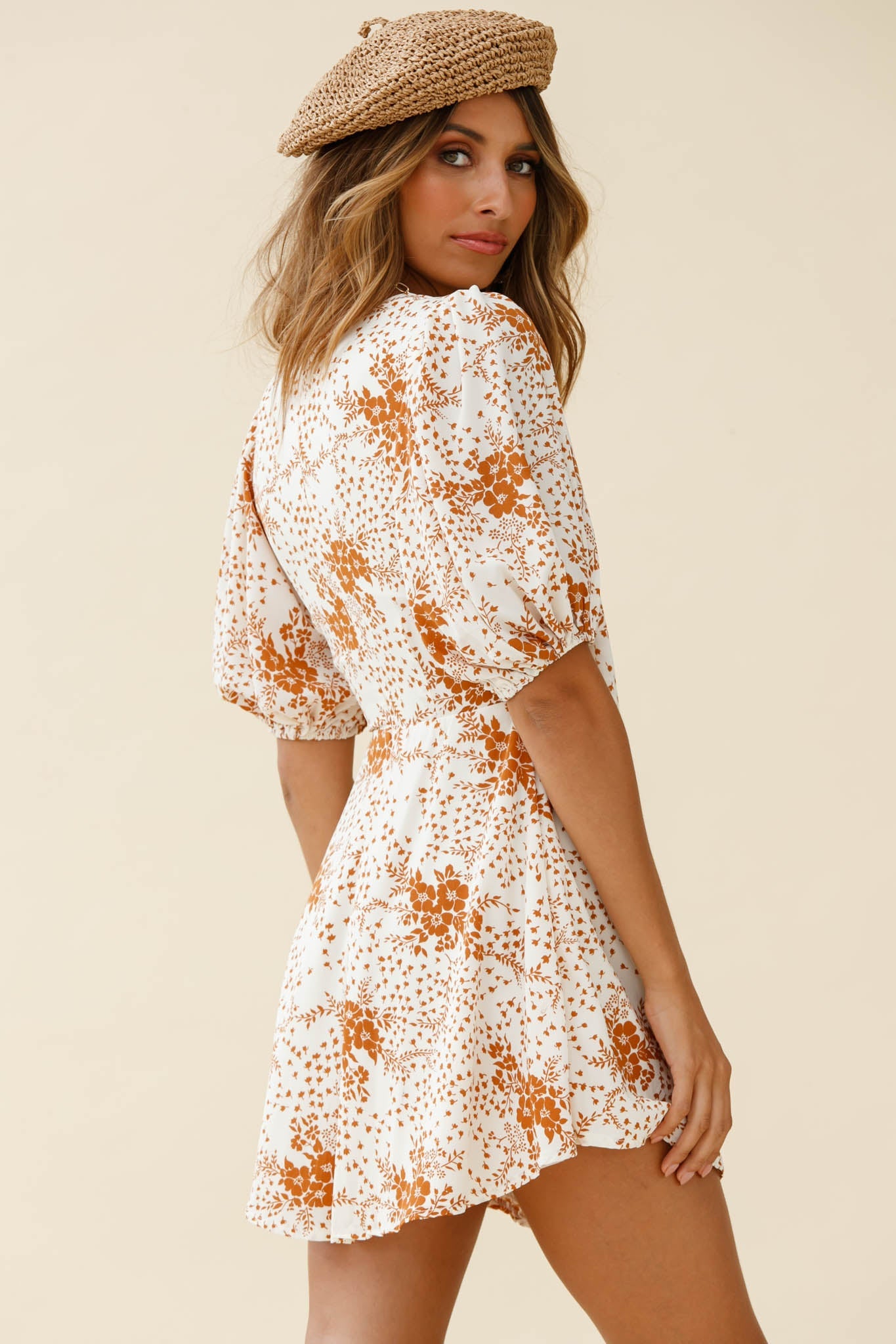 Portia Tied Bust Puff Sleeve Dress Flower Pattern Tan