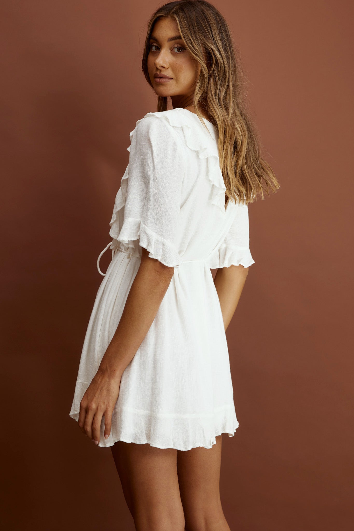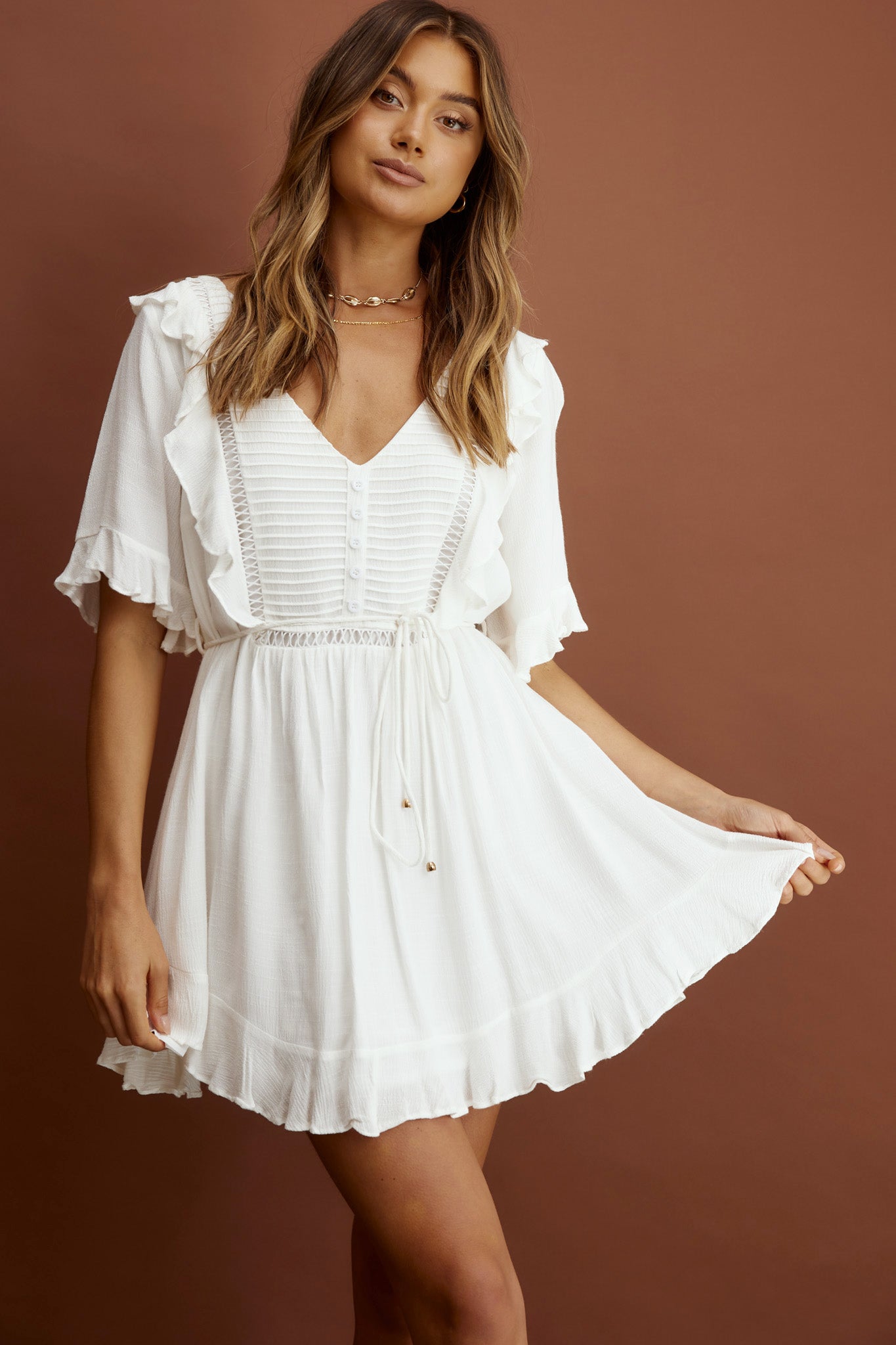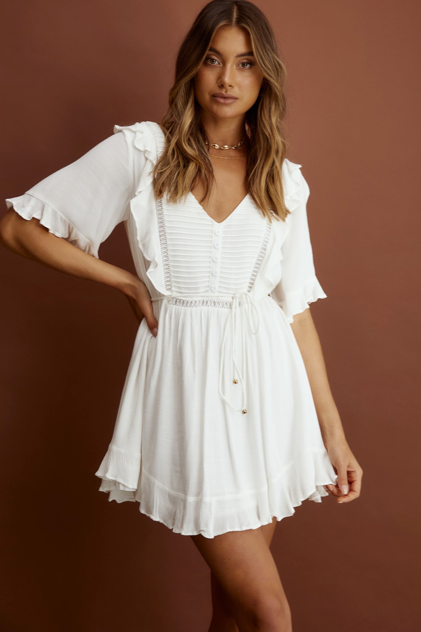 Summer is officially here and we are loving breezy styles that float as you walk. Our Promenade dress features a loose cut with a string tie around the waist and pretty ruffle accents. It looks amazing teamed with nude midi-heels or throw on some white sneakers for a cute, casual look.