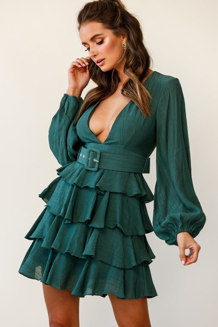 Make an entrance in our stunning Queensland dress. Featuring long balloon sleeves, a gorgeous tiered frill skirt, deep V-neckline and a waist belt with fabric buckle. This dress oozes flirty and fun. Perfect for a birthday party or date night, teamed with boots or nude pumps.