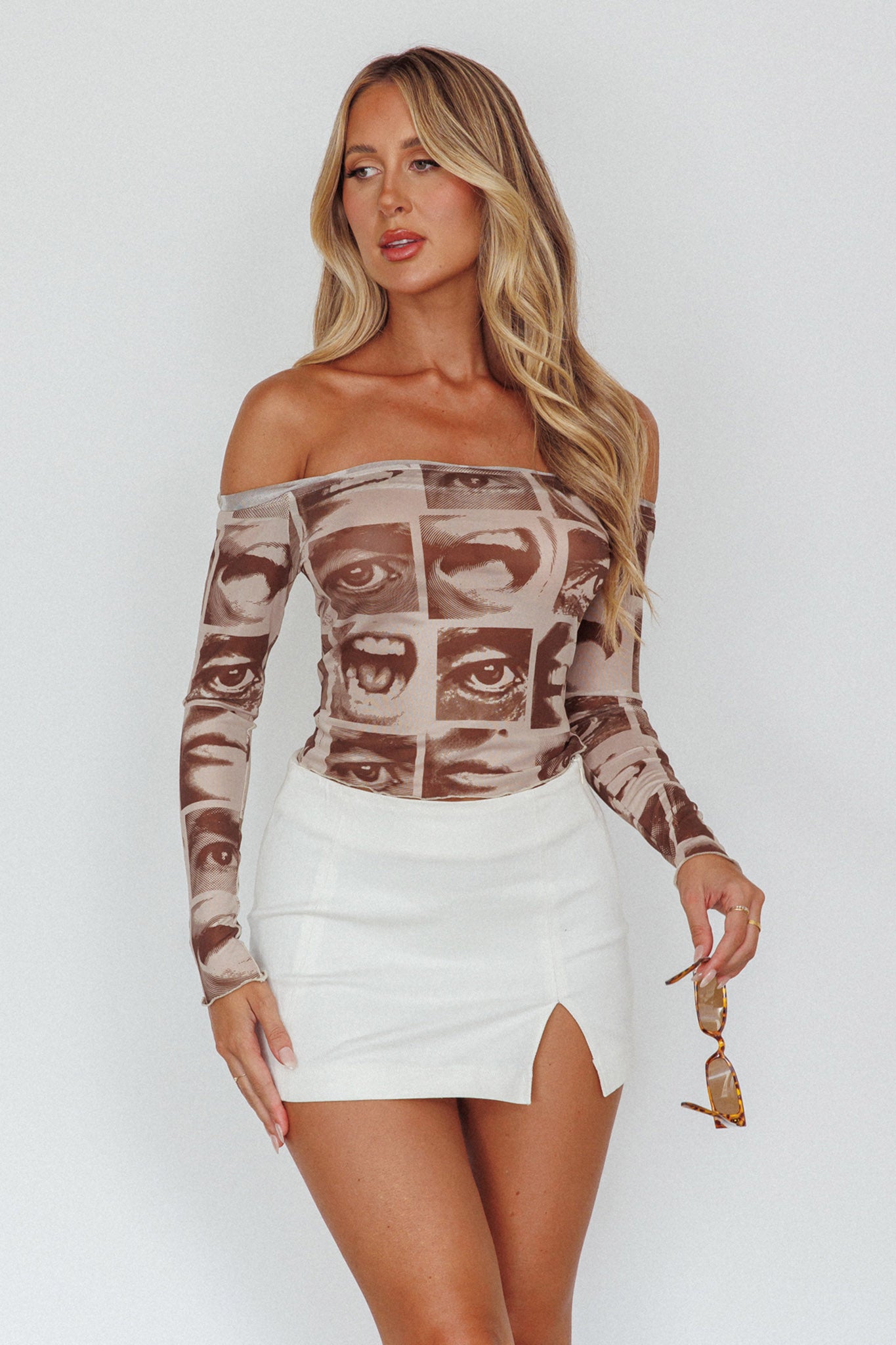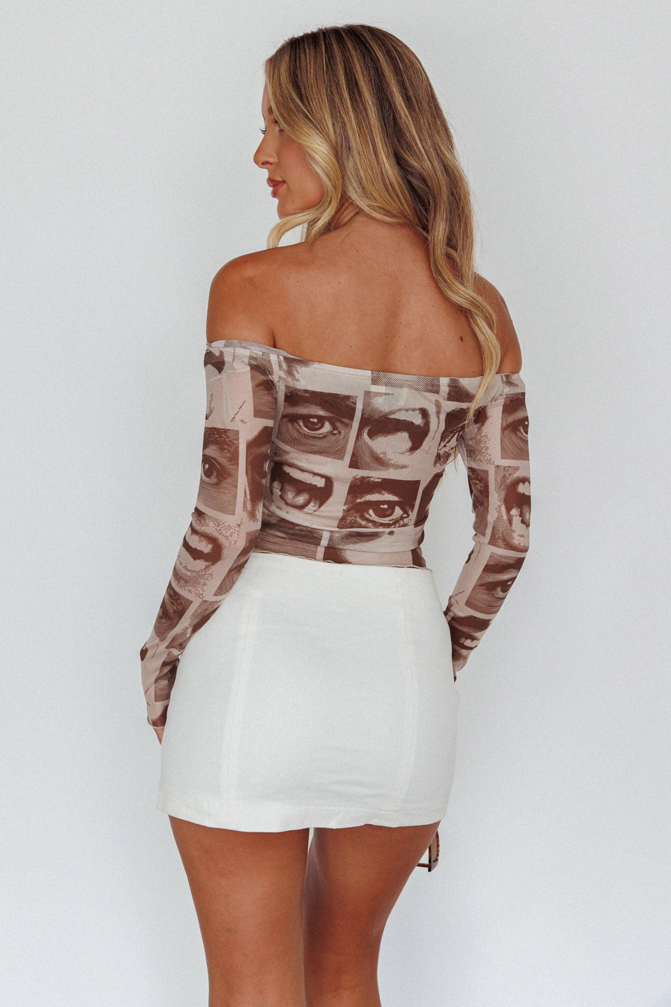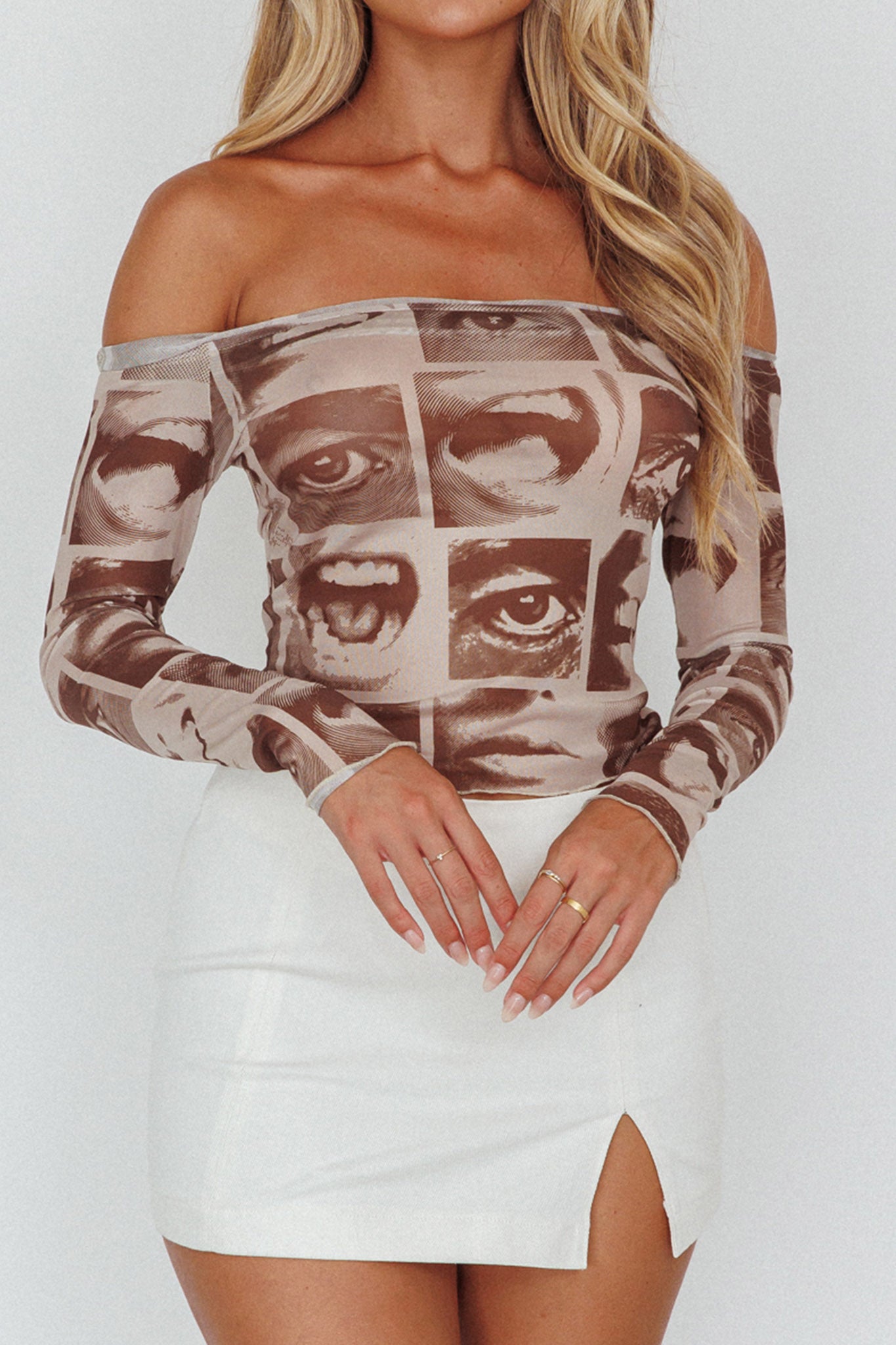Ramona Long Sleeve Off-Shoulder Top Print Brown