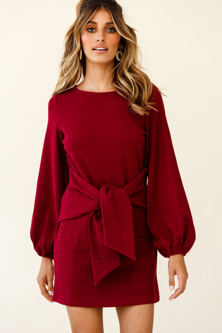 Rapt Waist Tie Balloon Sleeve Knit Dress Wine
