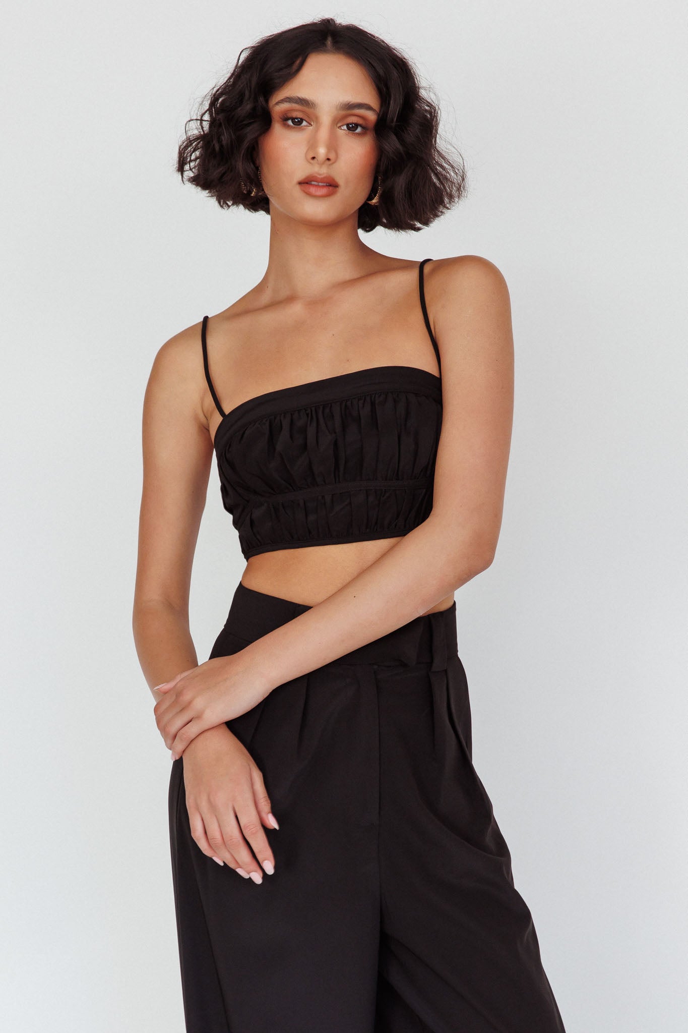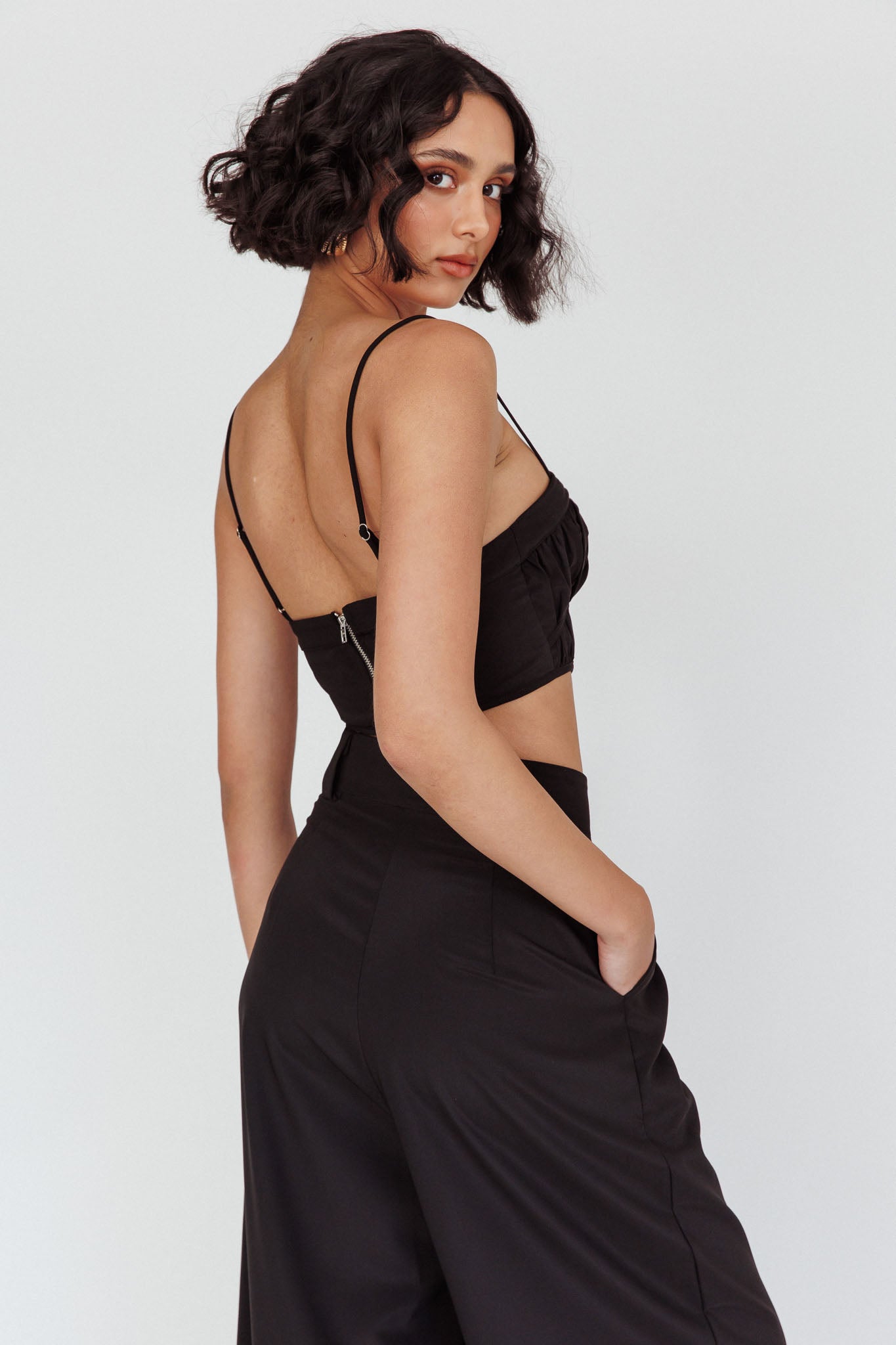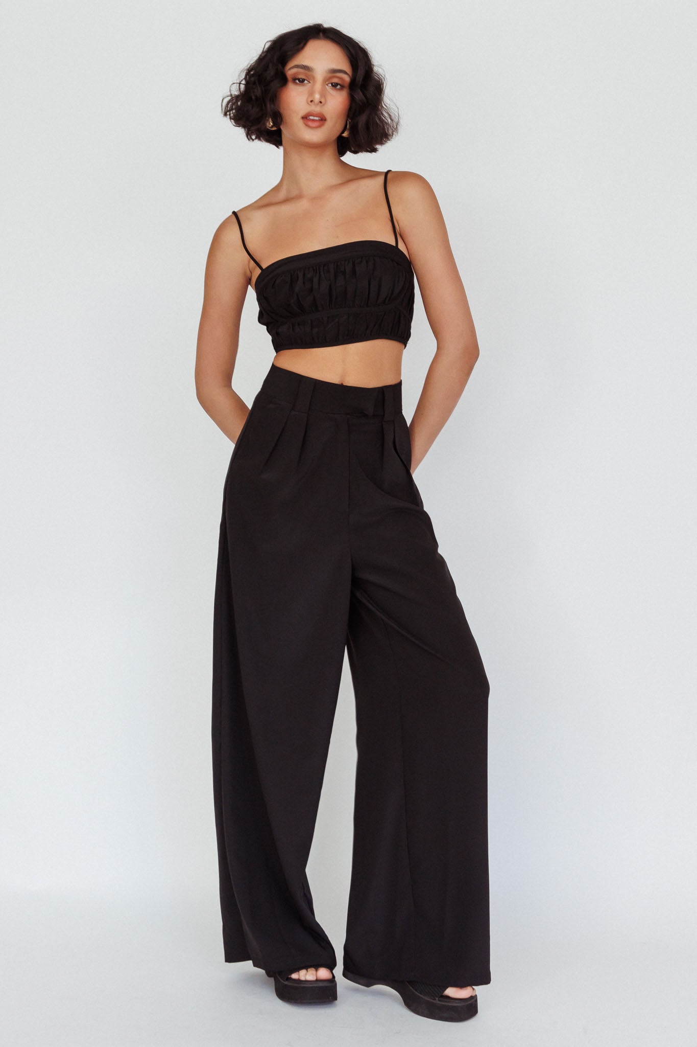 Steal the spotlight in our super cute Regal crop top. We are obsessed with its ruching detail throughout and chic silhouette. Perfect for a night out with the girls teamed with its matching pants and tan mules.