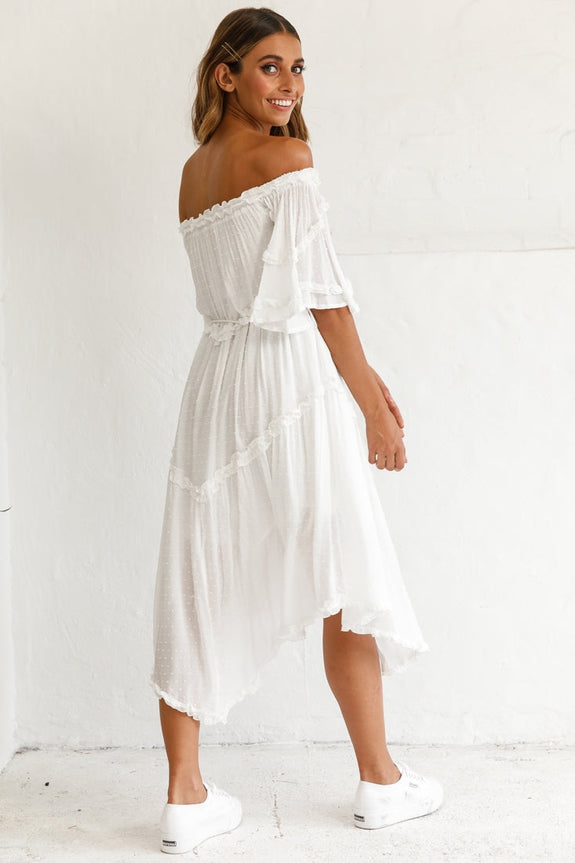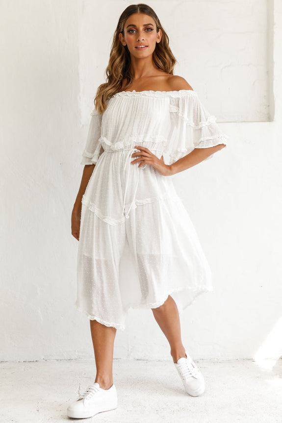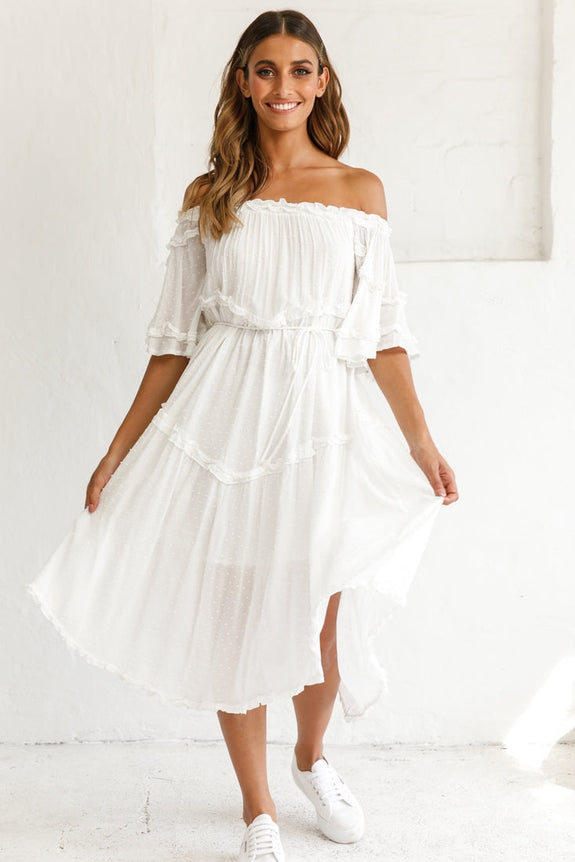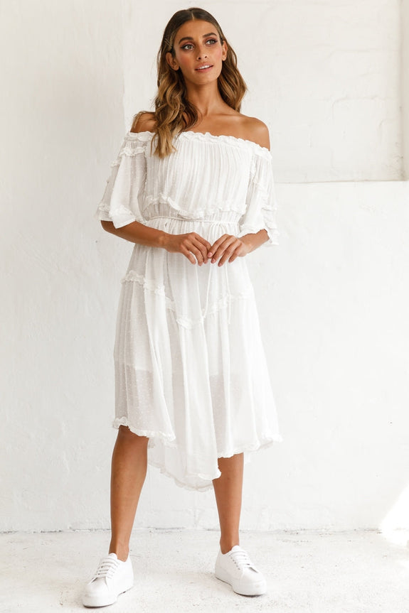 Renoir Off-Shoulder Frill Trim Midi Dress White