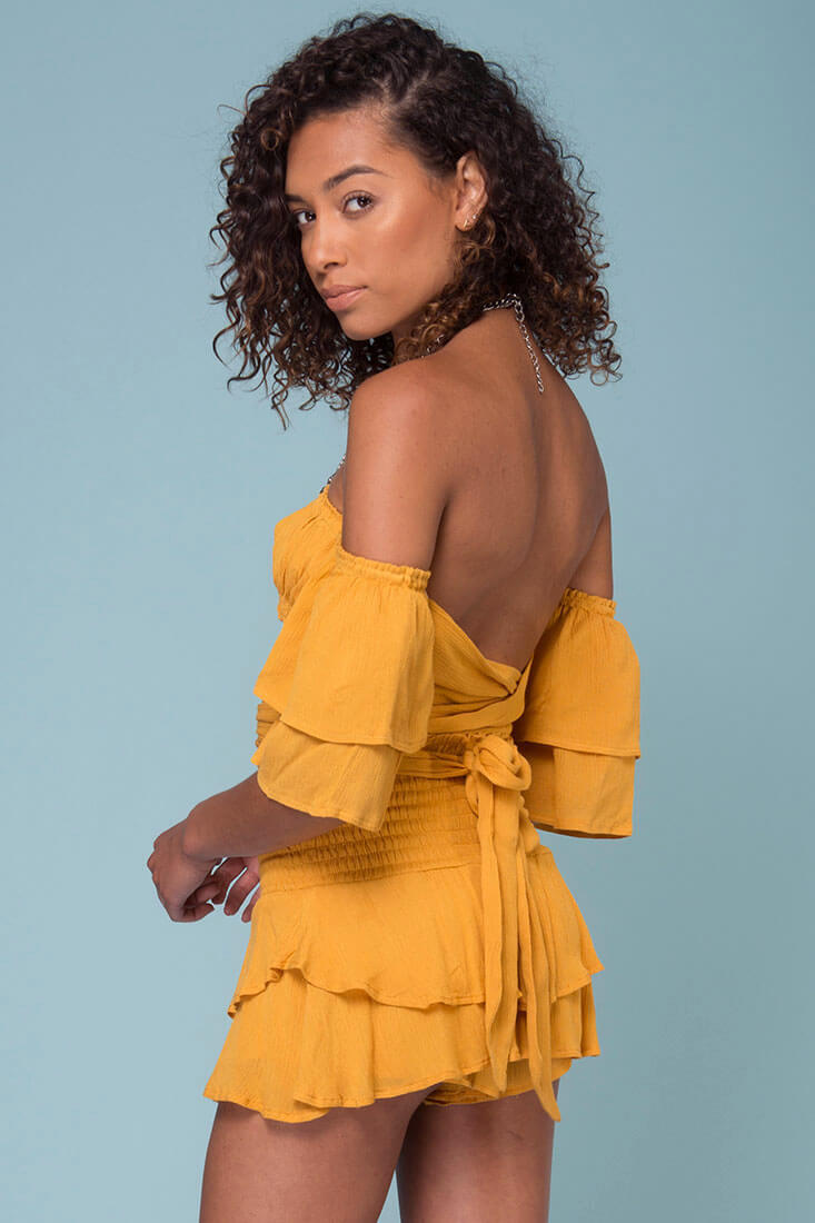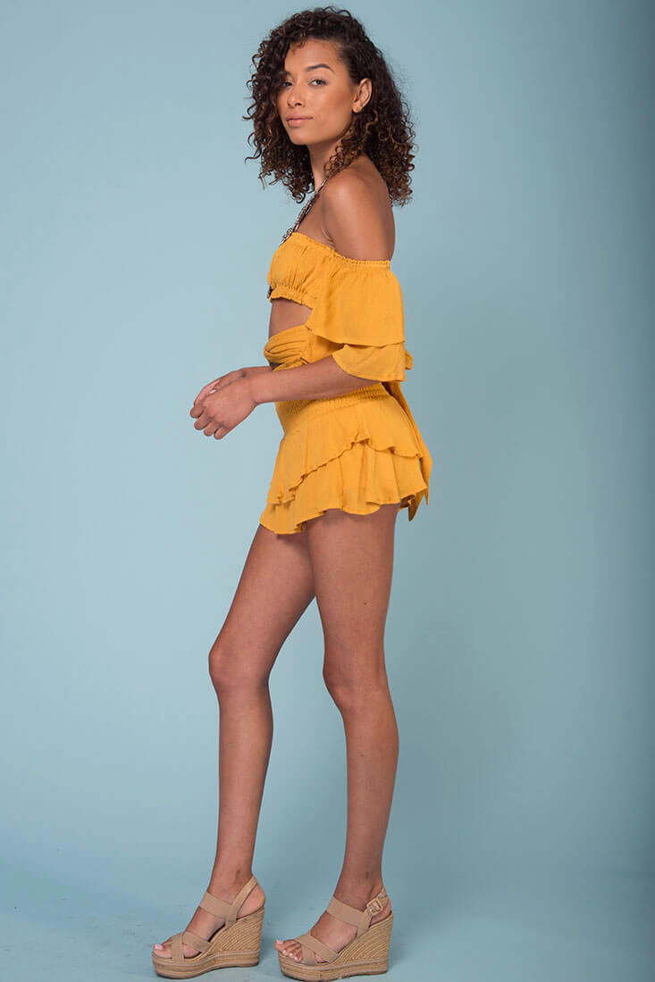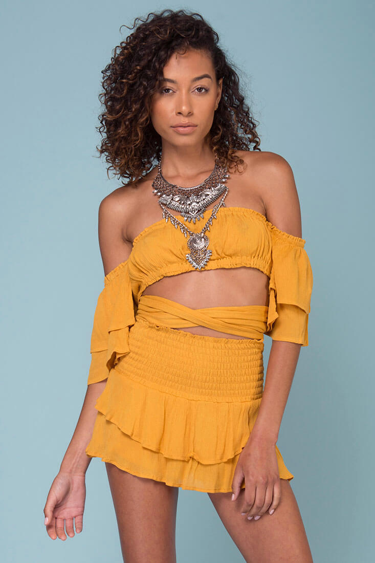 Ruffles everywhere! This bold colored set will look gorgeous anywhere! Off the shoulder bandeau top with exotic sleeves and wrap around skort look amazing on your next vacation or to brighten up your favorite bar. Pair with high brown-colored heels and statement earrings.