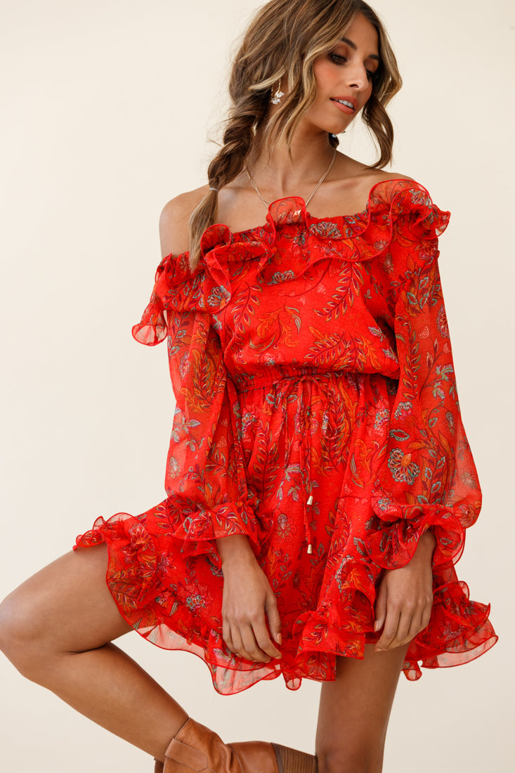 Turn heads in our super cute Rhiannon dress. Featuring an off-shoulder style with lettuce frill trim, long sleeves, elasticated waist with tie and the prettiest paisley-floral chiffon fabric. Perfect for brunch with your besties teamed with your favorite mules and tote.