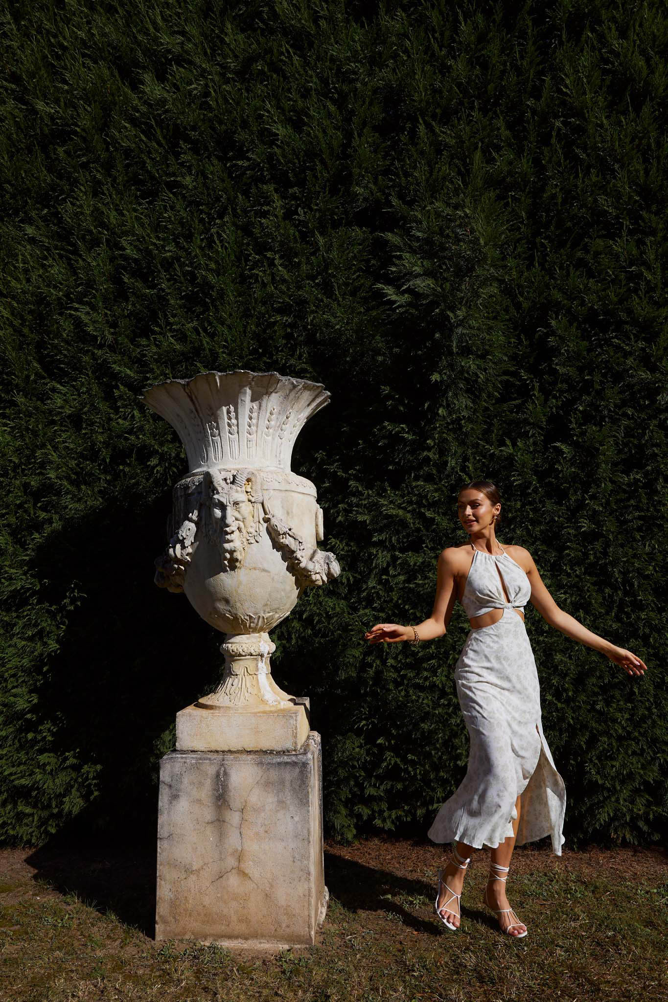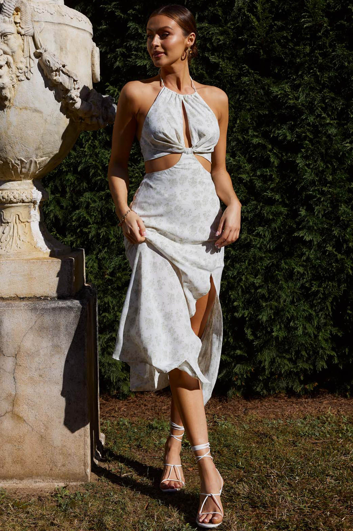 Make an entrance in our gorgeous Rising Sun midi dress. Featuring a cut-out bodice and sexy front split. Perfect for a flirty date with your lover or weekend brunching with your girls. Team it with strappy heels and a small purse for a look we are loving.