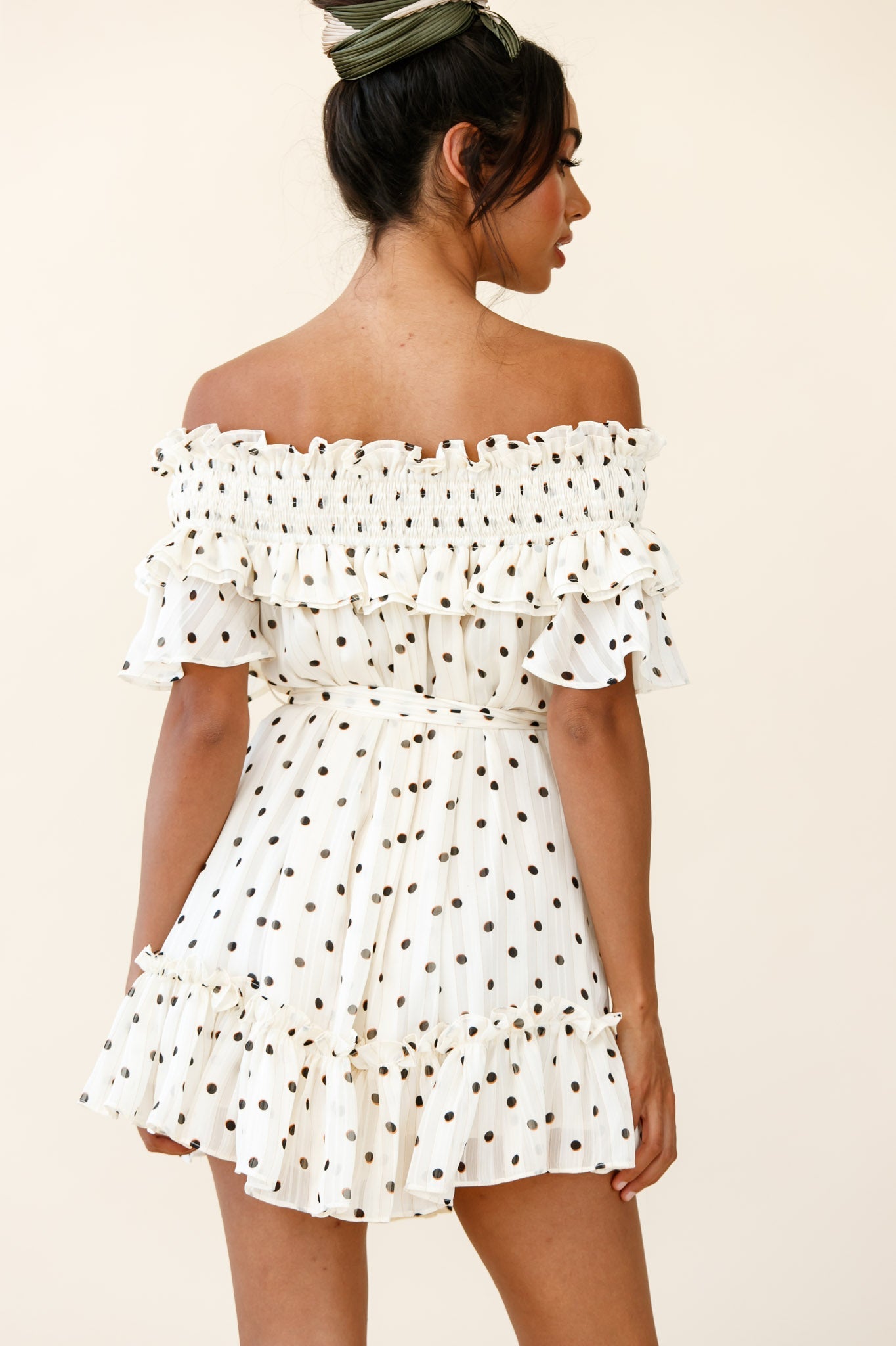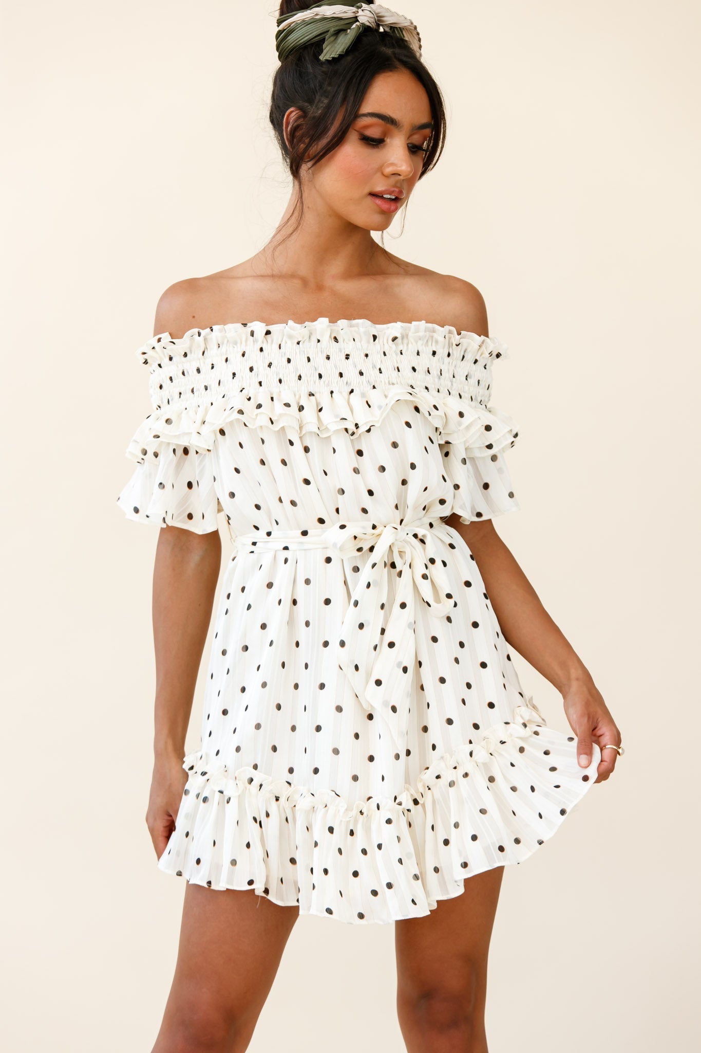 Rita Shirred Off-Shoulder Dress Polka Dot Print White