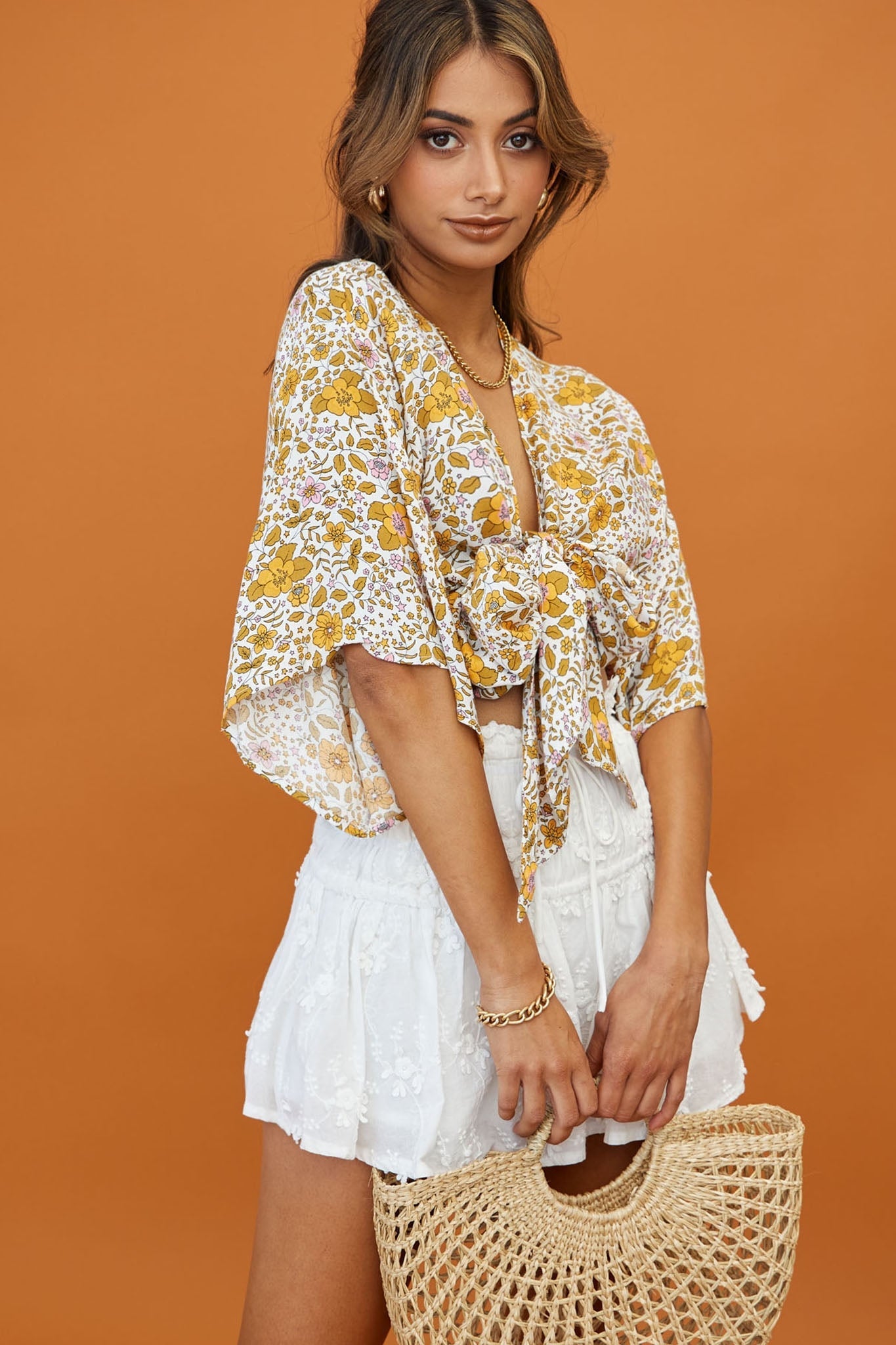 Rivera Deep-V Tie Front Crop Top Floral Print White/Yellow