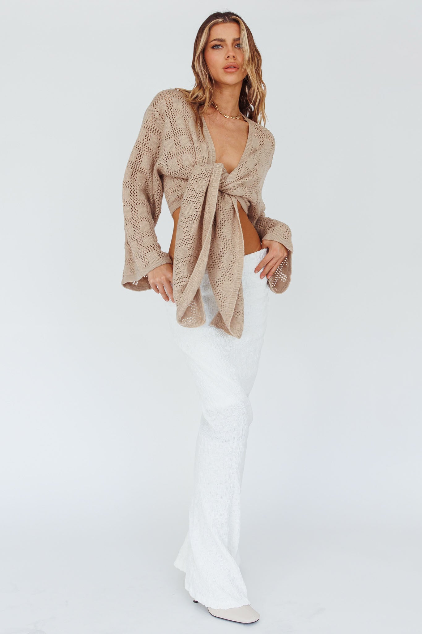 Rivera Deep-V Waist-Tie Top Crochet Sand