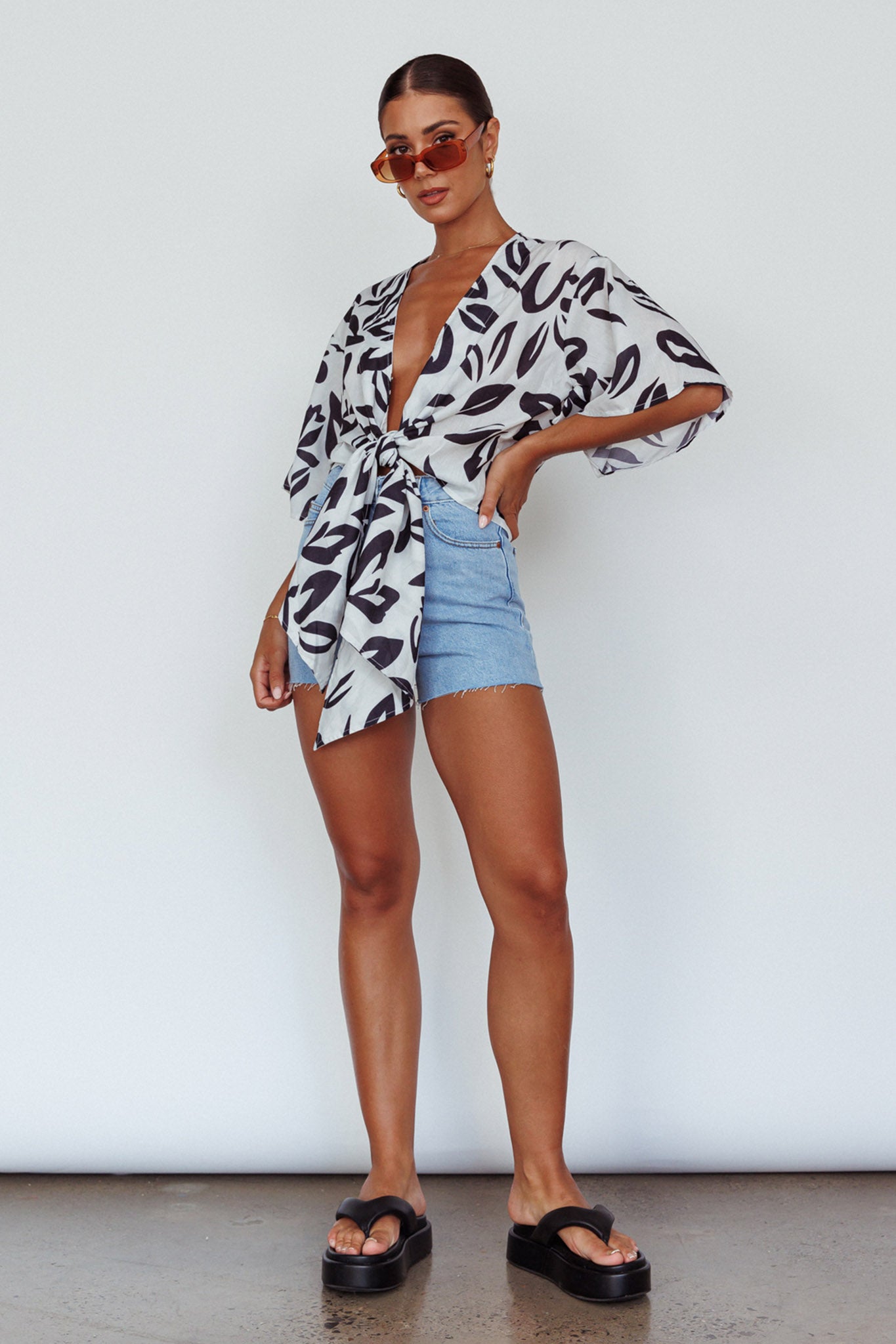 We are in love with this playful top featuring on-trend bell sleeves and a deep neckline that ties at the waist. Wear it to happy hour with the girls or a swanky rooftop bar teamed with mom jeans and mules. You'll steal the show.