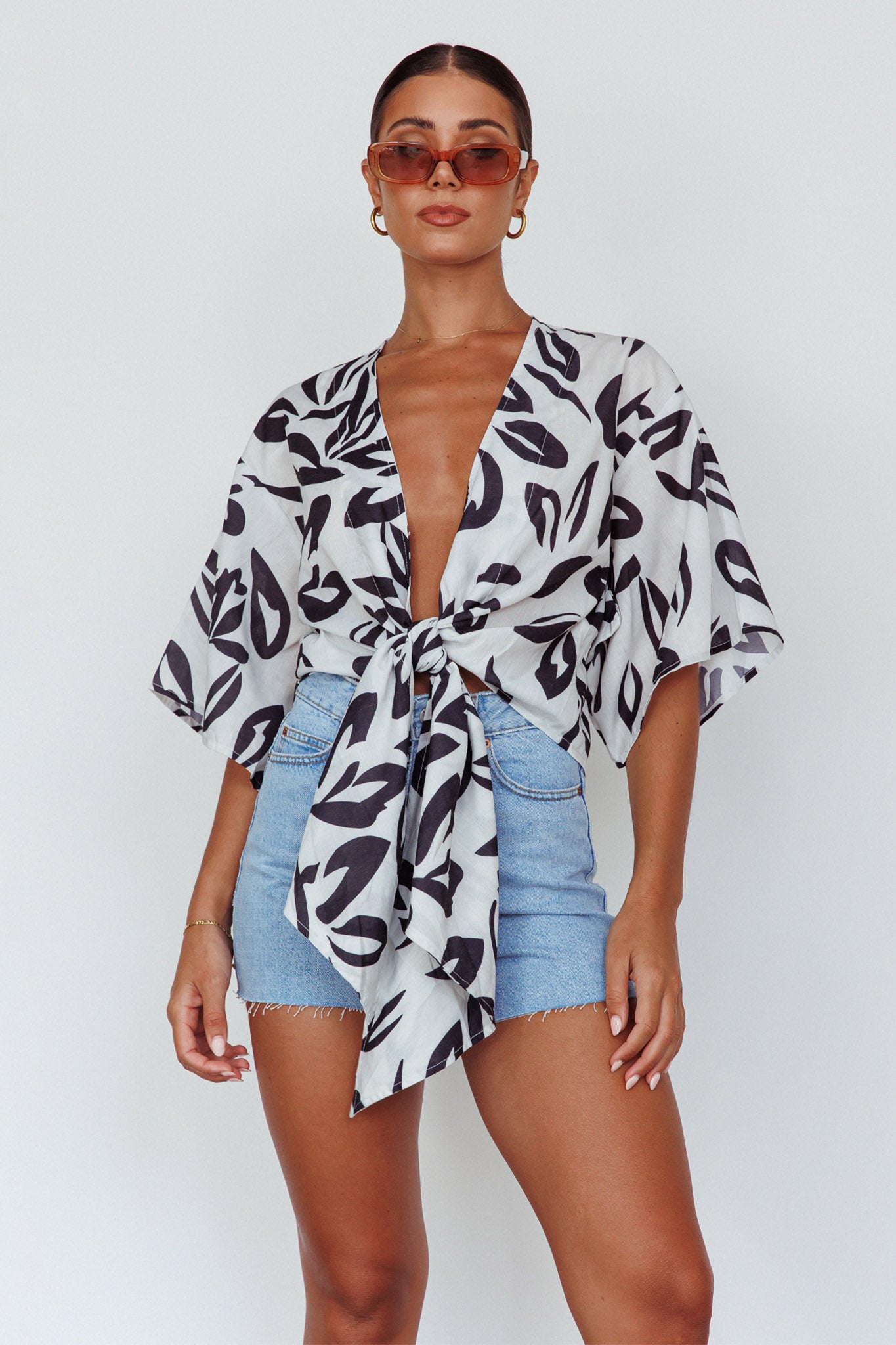 Rivera Deep-V Waist-Tie Top Leaves Black