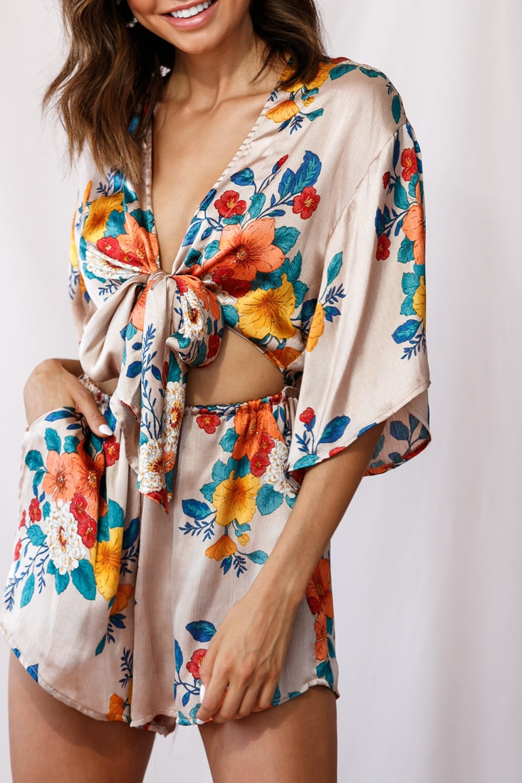 We are in love with this playful romper featuring on-trend bell sleeves, a tie-knot design over the bust and beautiful, silky, floral print fabric. Wear it to happy hour with the girls or your next swanky rooftop pool-party teamed with strappy nude heels and chunky gold hoop earrings and you'll be stealing the show.