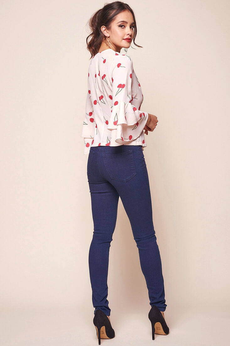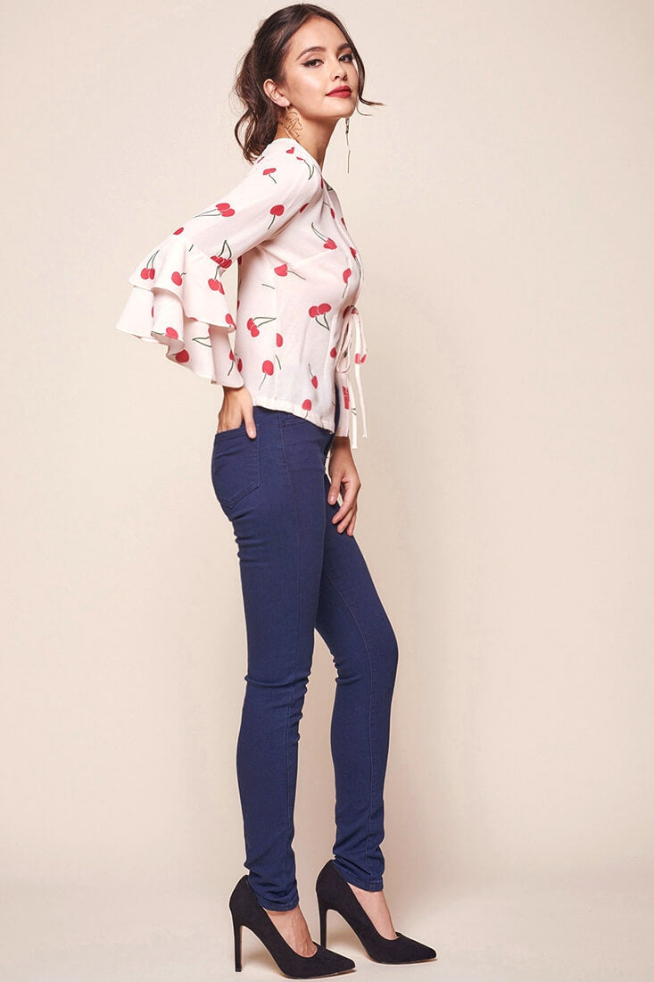 So sweet, you'll want to take a bite. This flowy top with lovely cropped bell sleeves balances the plunging neckline and slinky wrap tie. Pair with high waisted shorts and glowing skin!