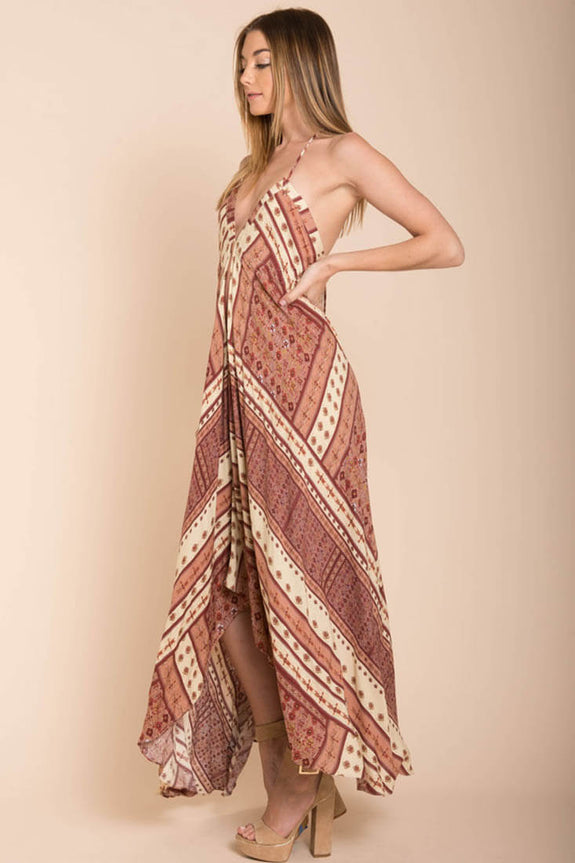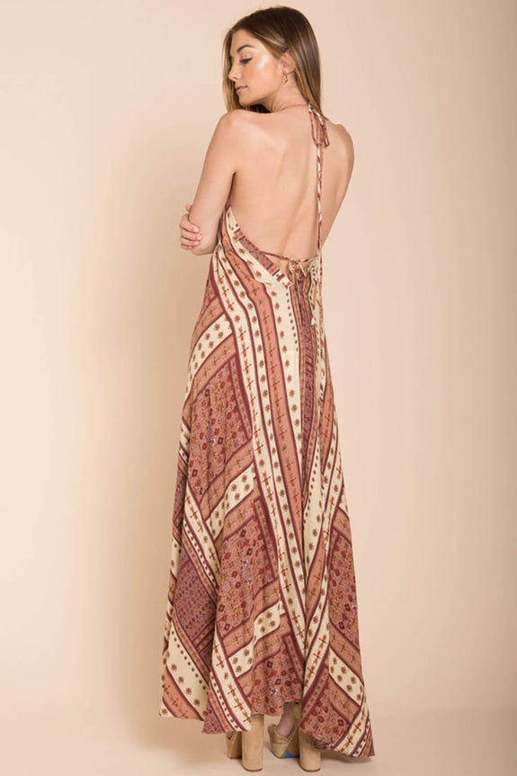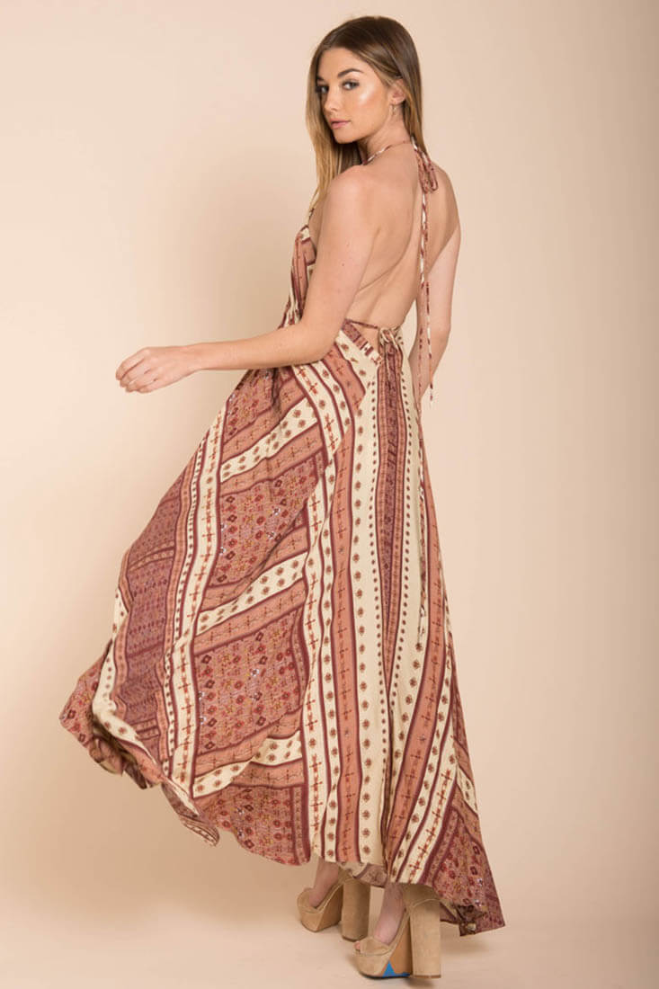 Send bohemian beach babe vibes no matter where you are in the Romani Fall Maxi dress. This dress captures the essence of wanderlust as the sun kisses your exposed back. Pair with open-toed flat sandals for your wondrous adventures.