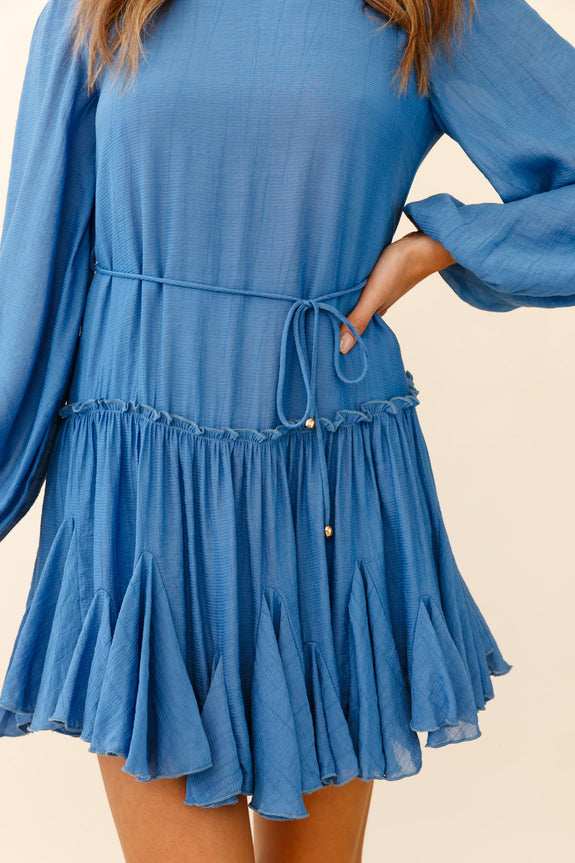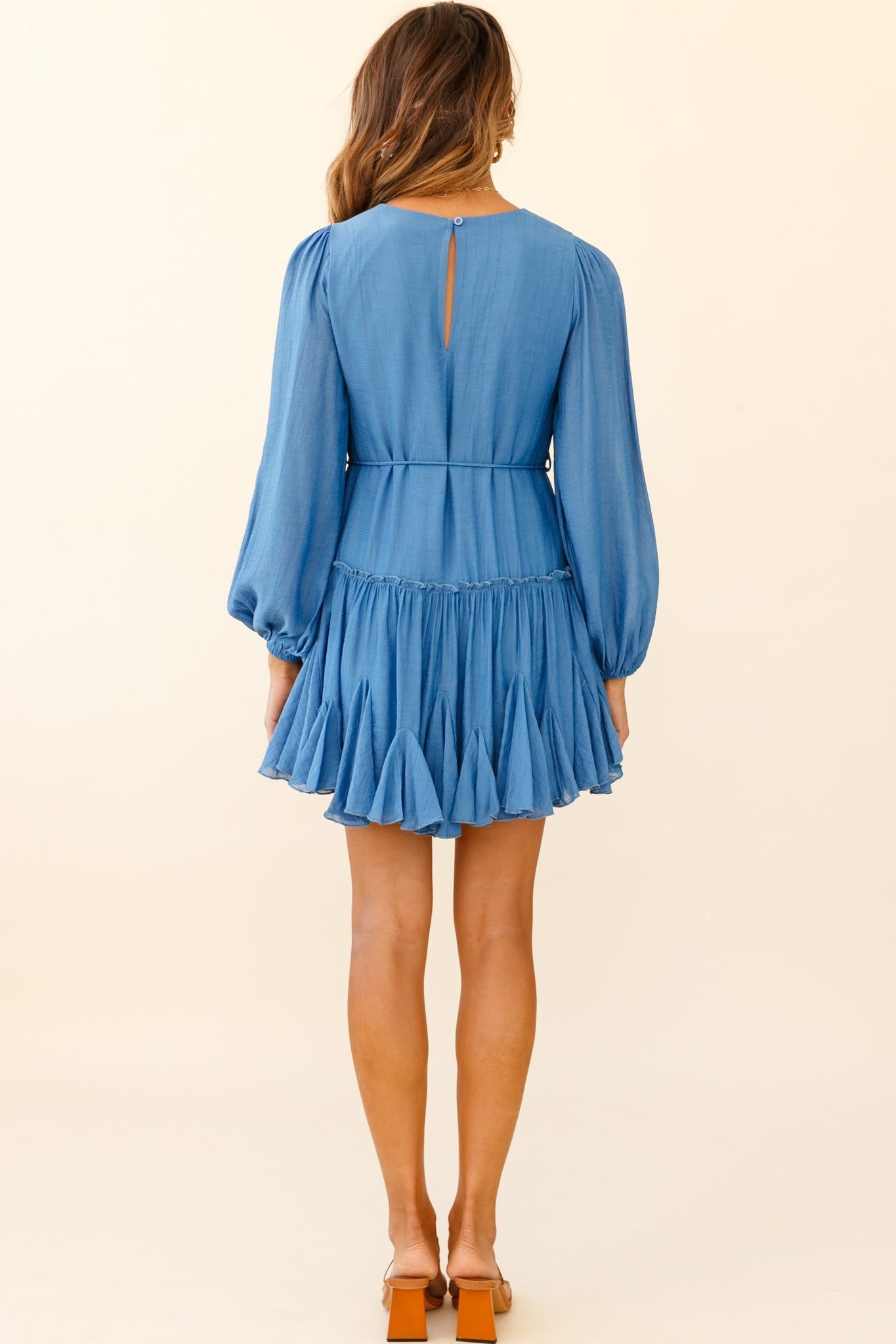 Rosabel Balloon Sleeve Fluted Hem Dress Denim Blue