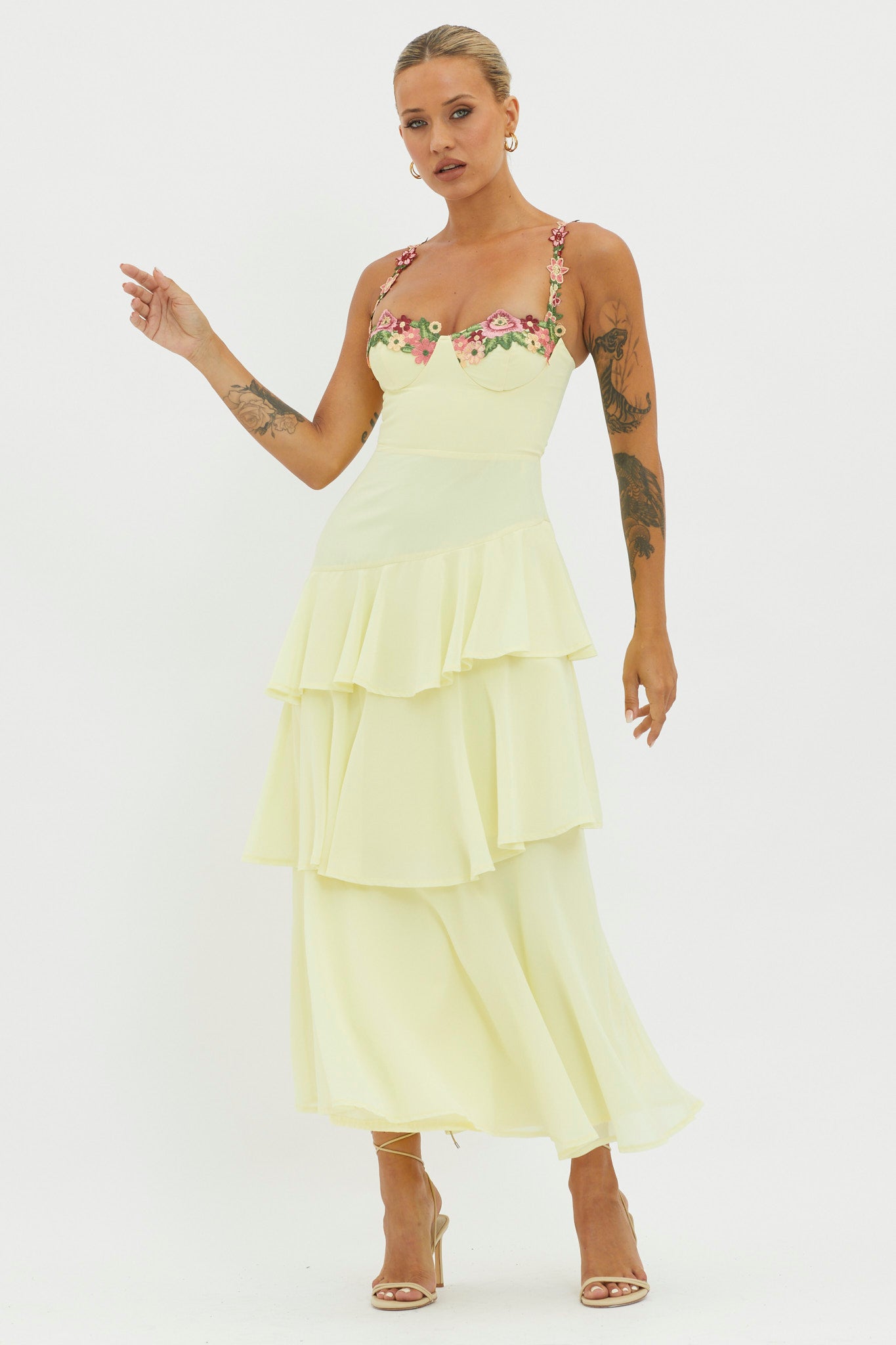 Rose Garden Tiered Ruffle Floral Trim Dress Lemon