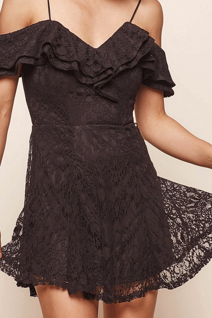 Cast a spell on anyone who looks your way with this sweet party dress. Perfect for a night out on the town, this dress features gorgeous, lace fabric, sweetheart neckline with a ruffle trim and shoestring straps. We love the sexy mini-length. Pair with gold hoops and nude heels.