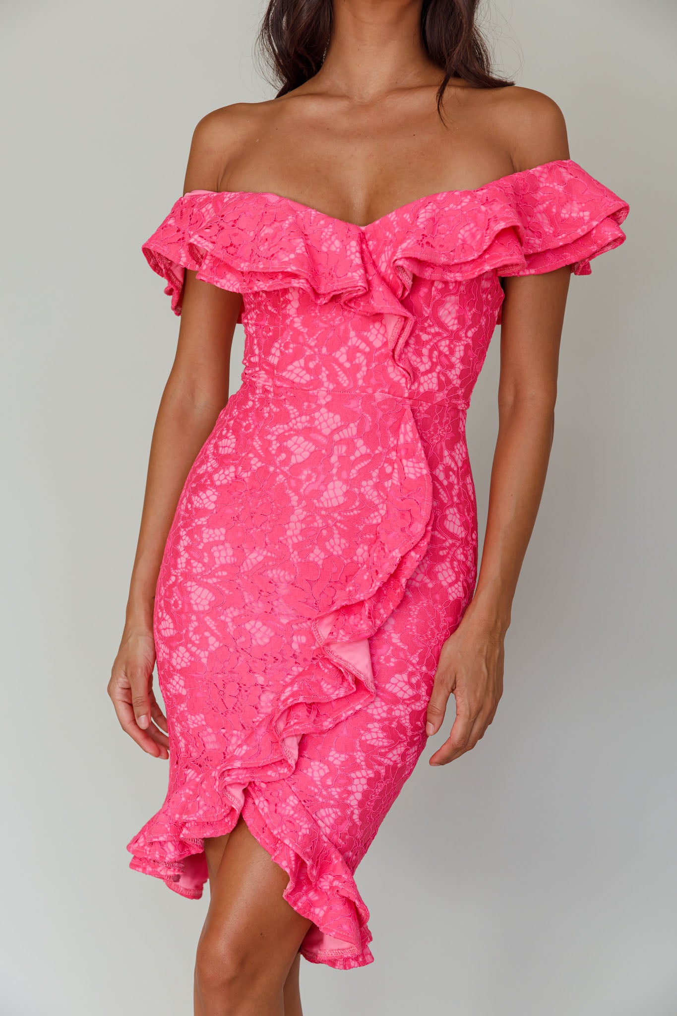 Rossi Off-Shoulder Double Ruffle Lace Dress Hot Pink