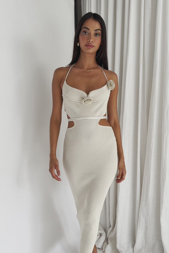 Rue Rose Accent Ribbed Knit Midi Dress Beige