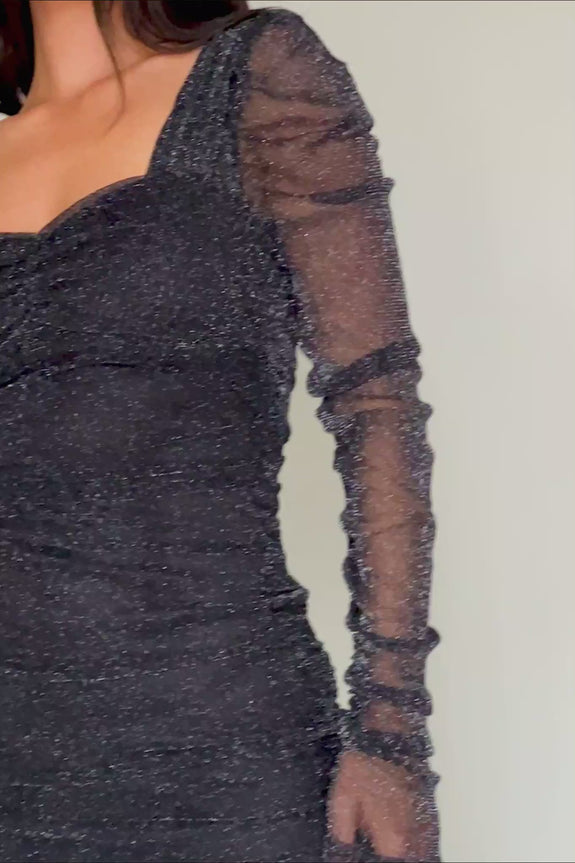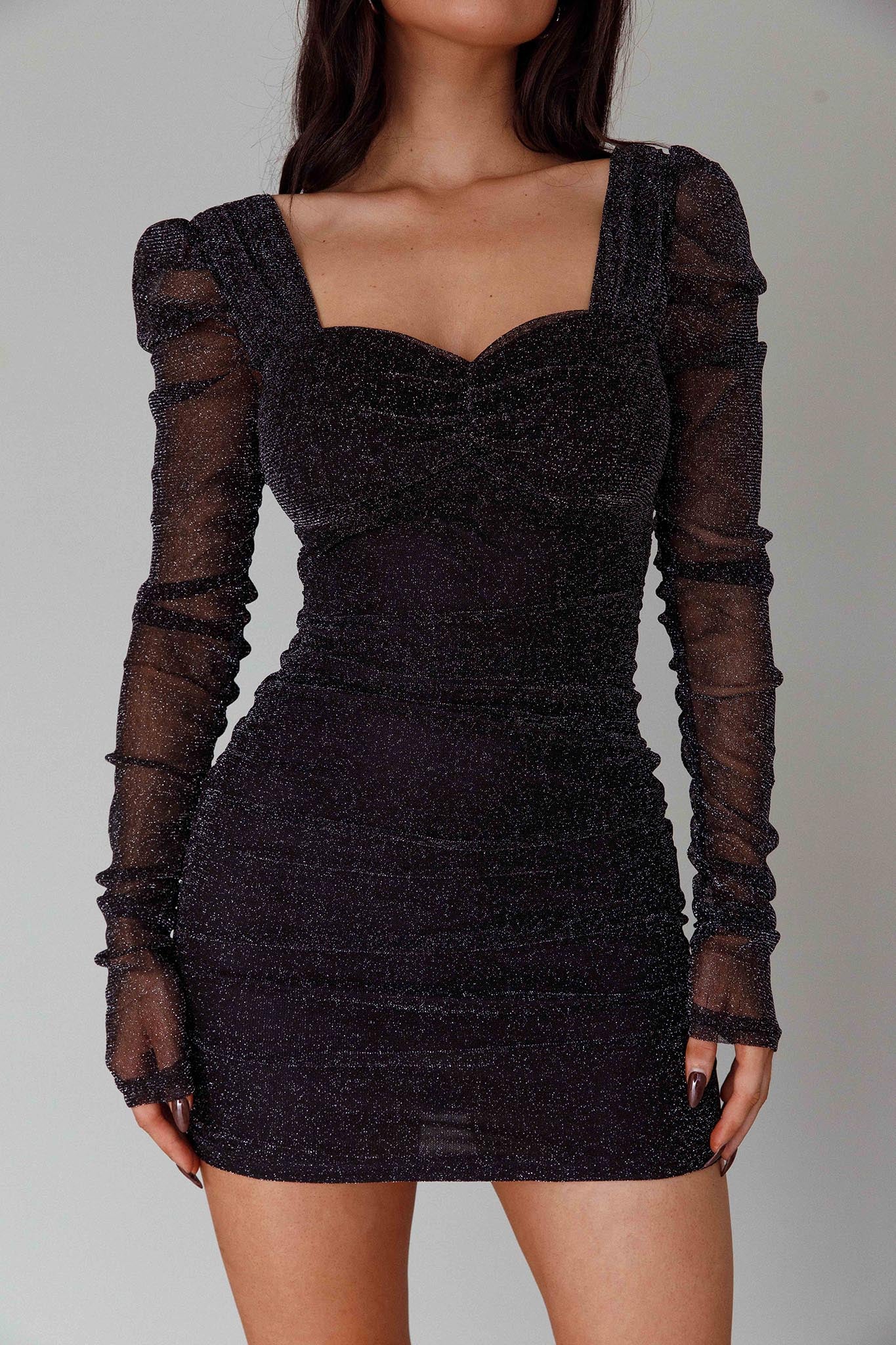 Turn up the heat in our sexy Ryah mini dress. We are in love with its sheer sleeves and sparkly fabric. Perfect for a romantic date night or glam girls' night out. Team it with diamante heels and a mini purse for a head-turning look.