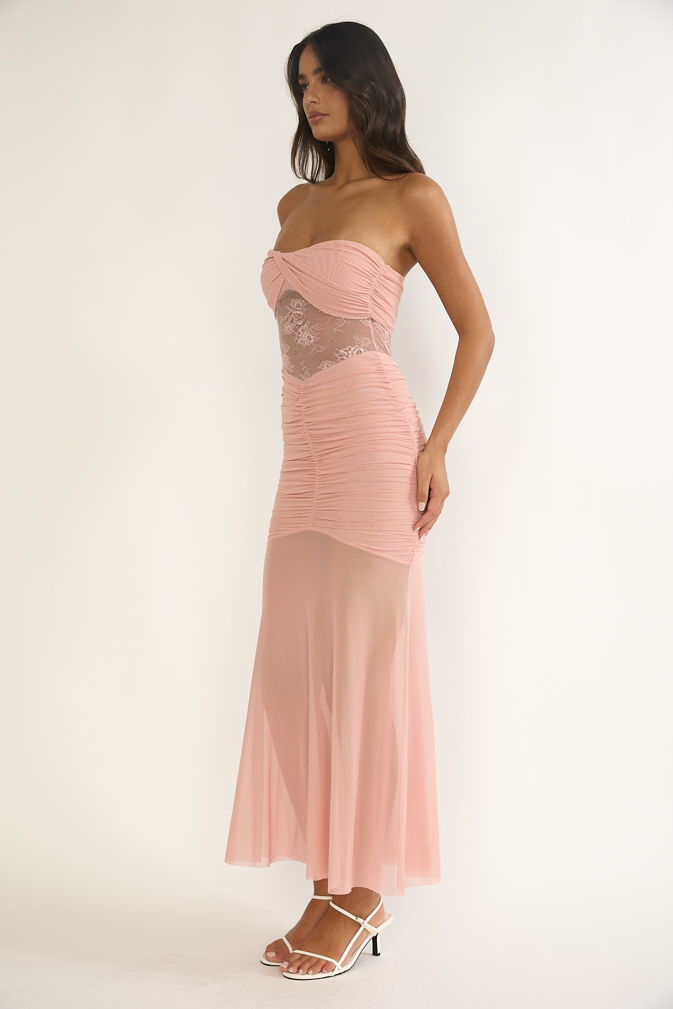 Steal the limelight in our sexy Sade maxi dress. We are in love with its sheer, lace detail and strapless design. Wear it to a glam birthday dinner with your girls, teamed with nude, strappy heels and a chic clutch to complete the look.