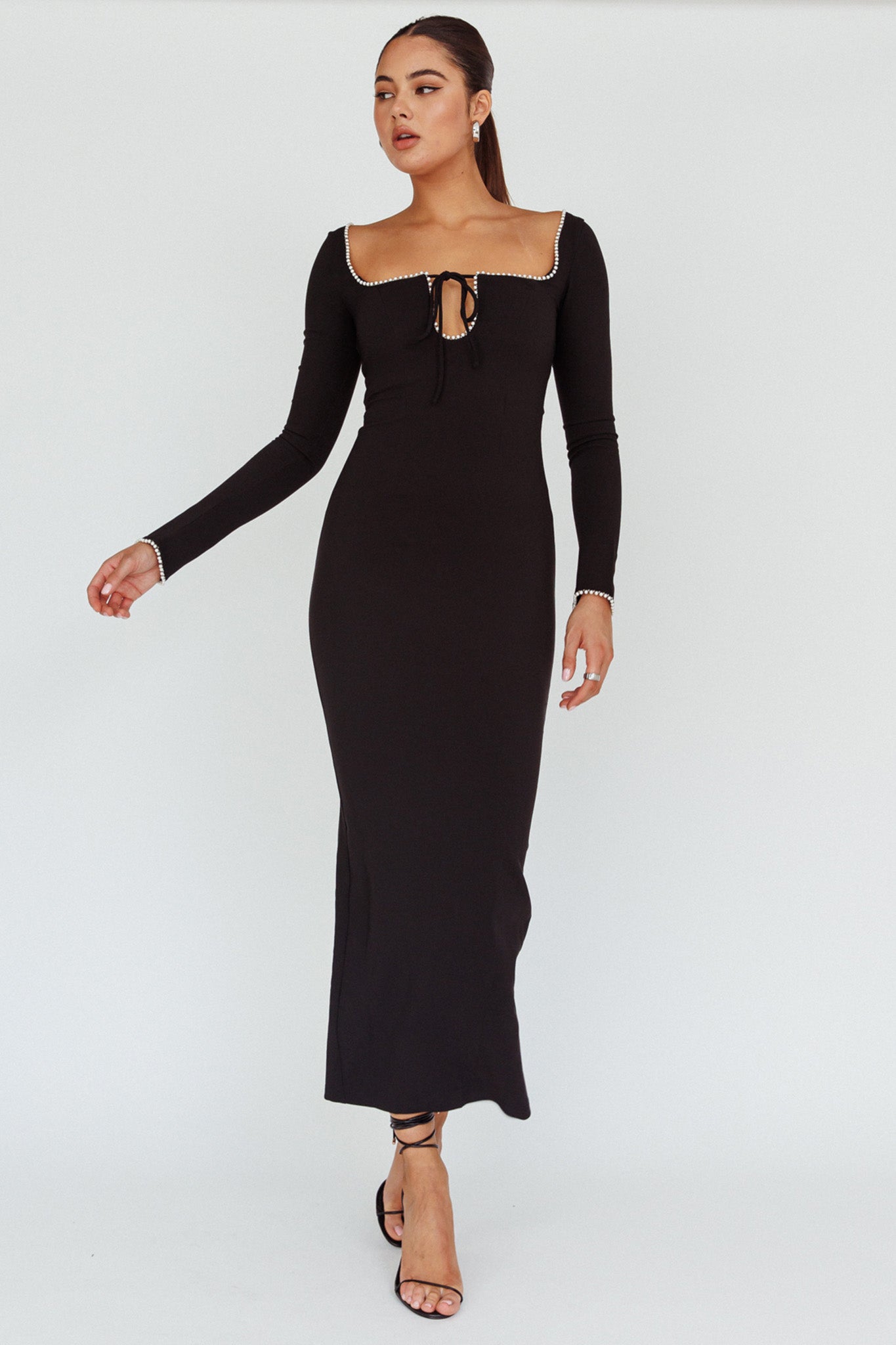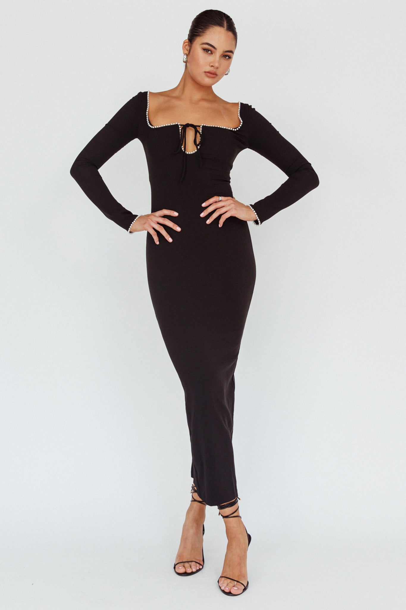 Steal the spotlight in our Samantha Midi Dress! Perfect for a date night, we are obsessed with its pearl detailing on the neckline and wrists. Style yours with heels and curls for all the attention.