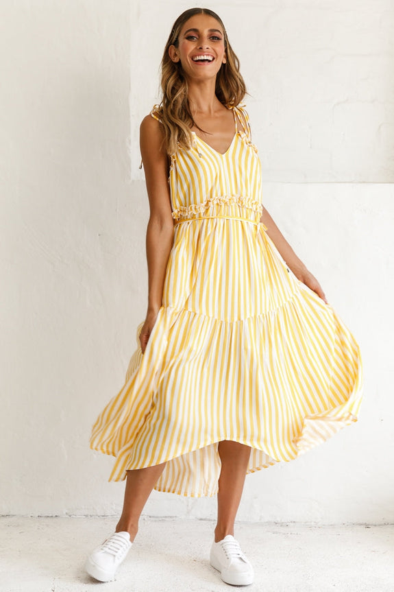Santa Monica String Tie Maxi Dress Stripe Print Mustard