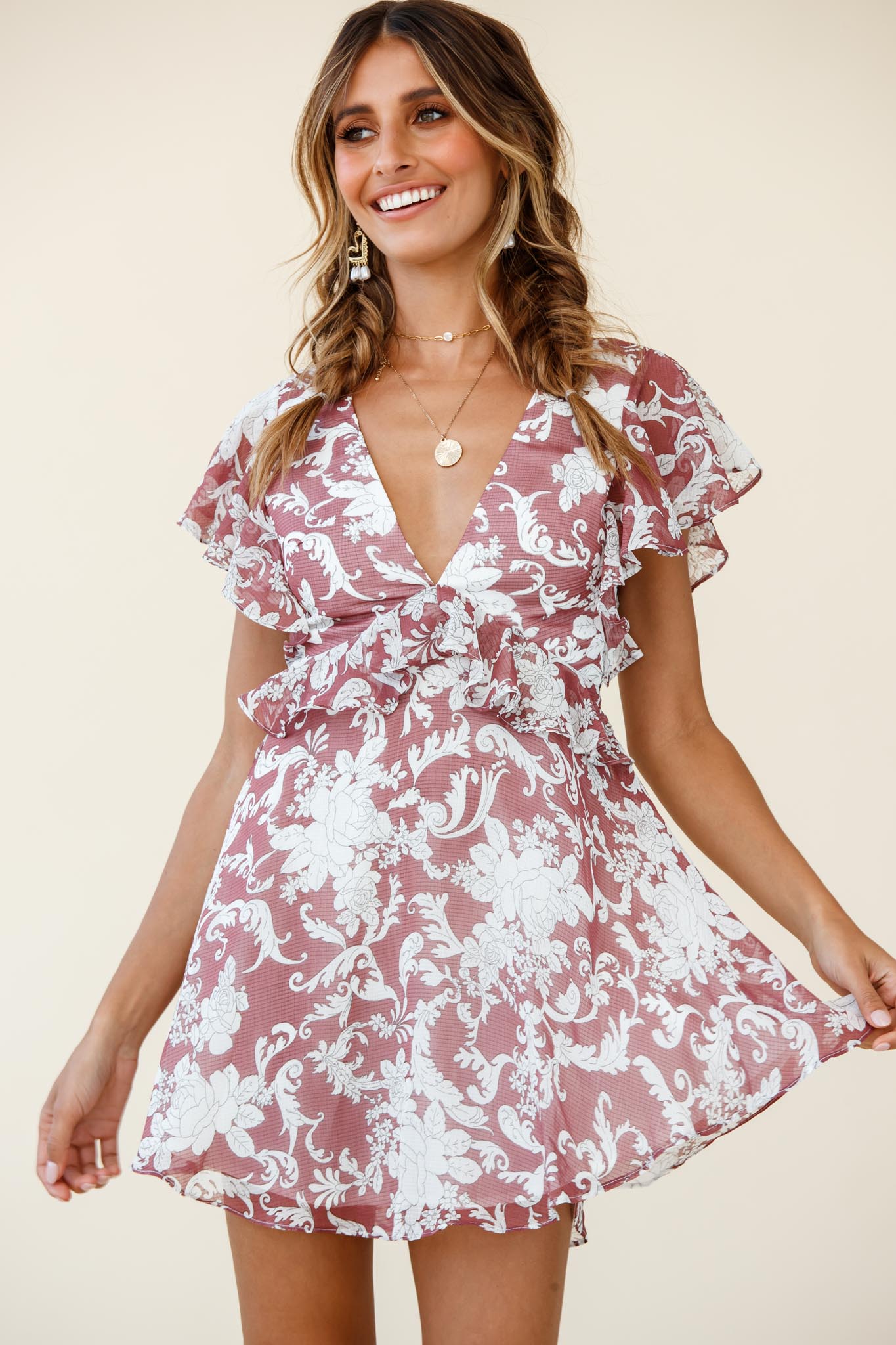 Say That Again Ruffle Shoulder Dress Ornate Floral Print Maroon