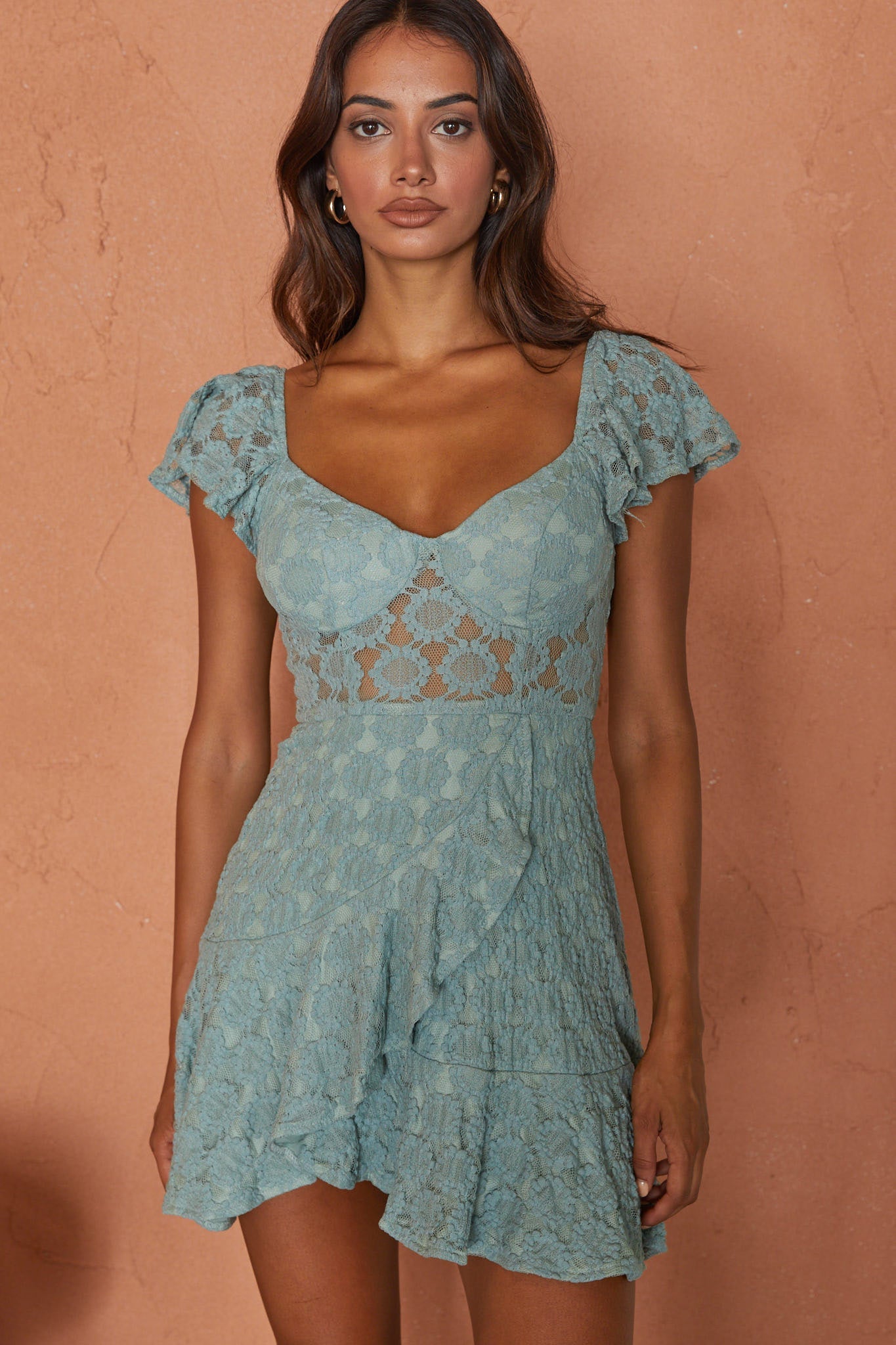 Secret Crush Flutter Sleeve Floral Lace Ruffle Hem Dress Mint