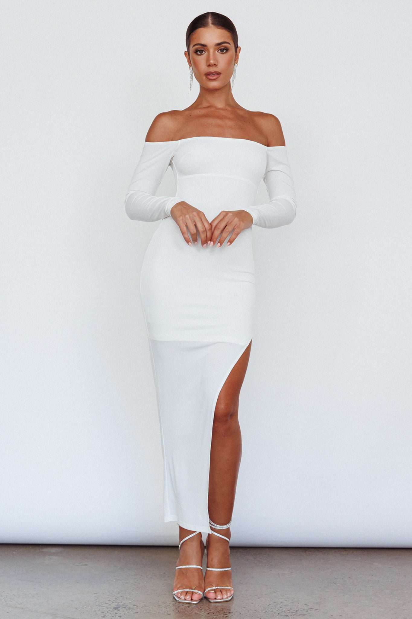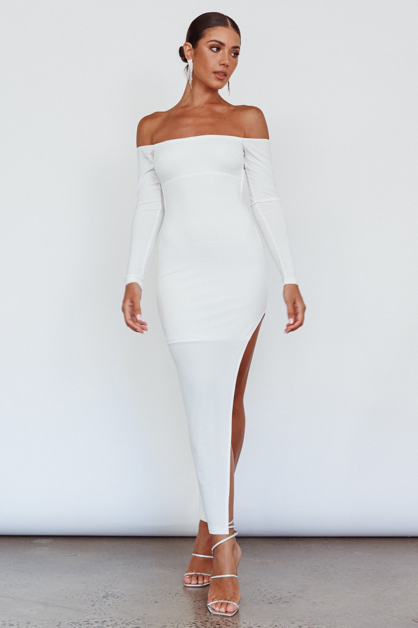 We are head over heels for our Sentimental Mood midi dress. Featuring an off-shoulder style and a sexy, thigh-high split. It's perfect for a flirty first date or a girls' night out! Team it with strappy, tie-up heels and a purse for a look that will turn heads.