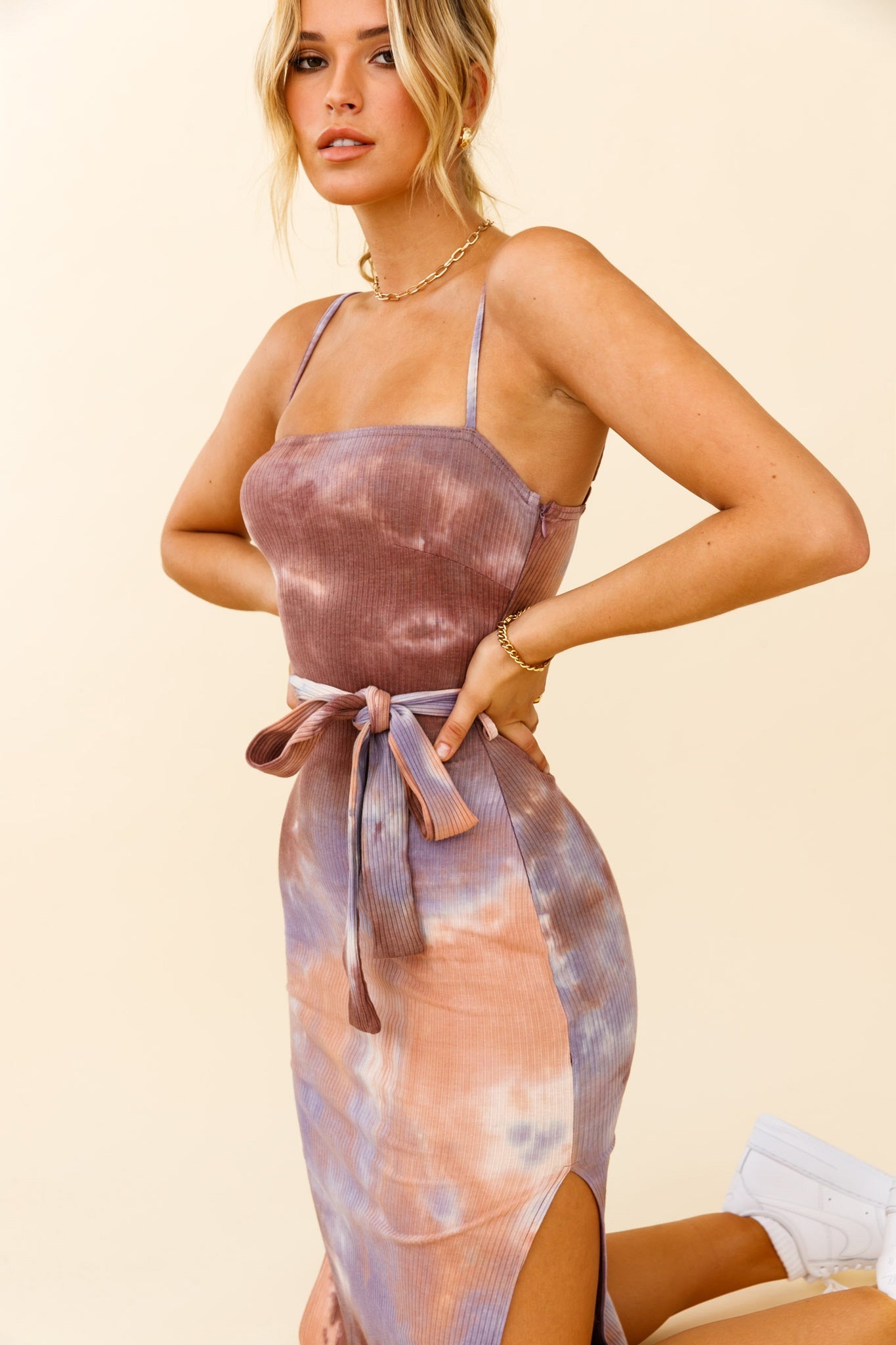 Serenade Me Square Neckline Side Split Midi Dress Tie Dye Brown/Lilac