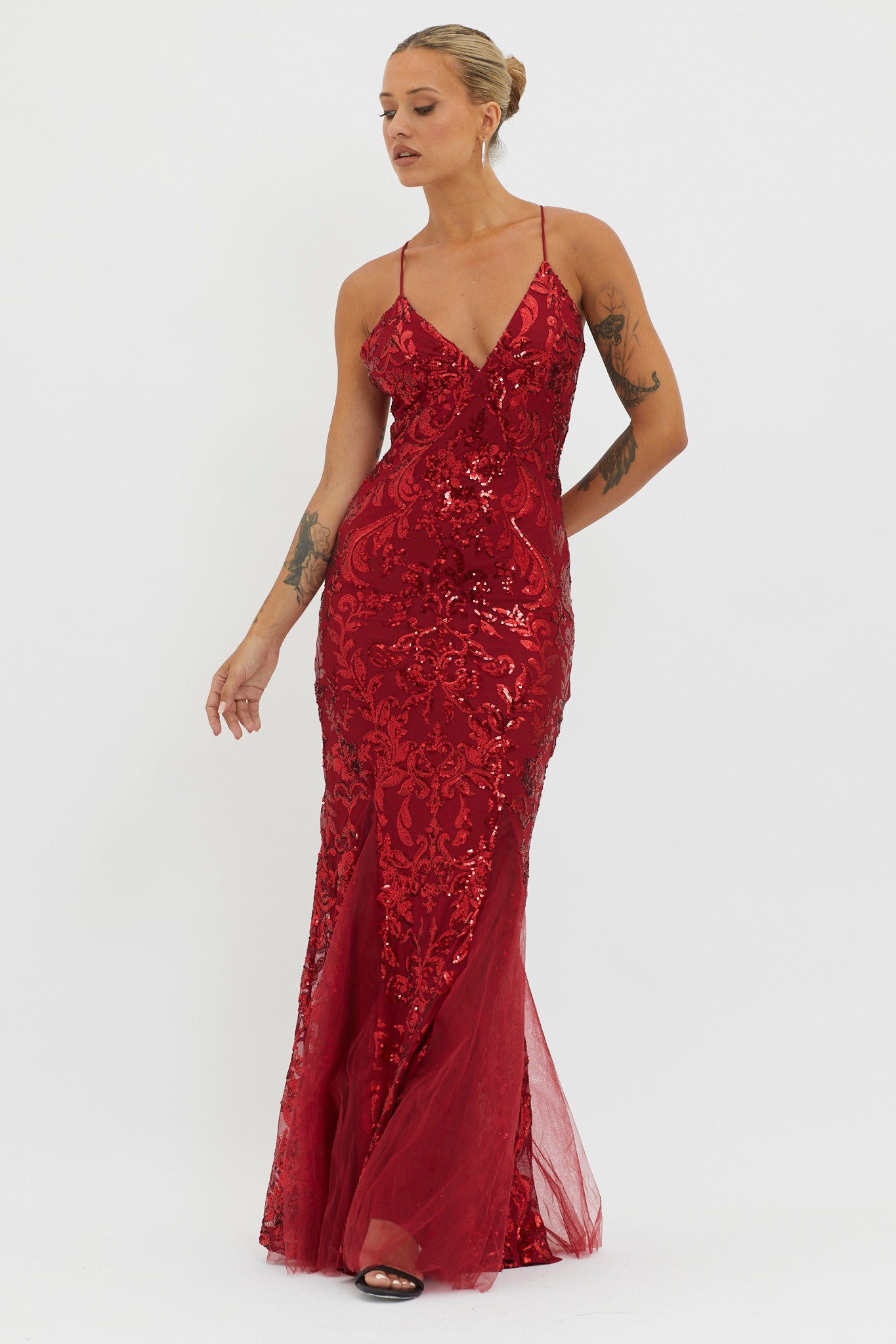 Serenade Song Godet Hem Sequin Maxi Dress Red