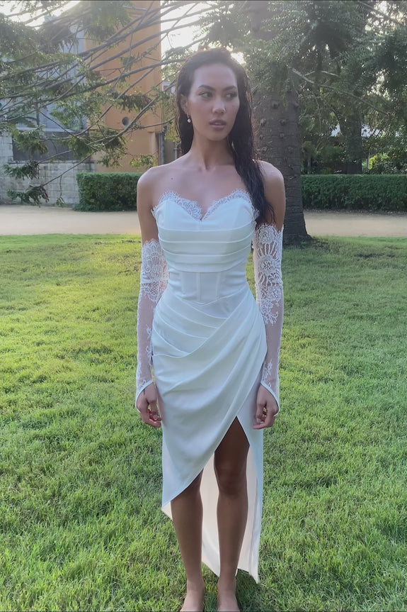 Light up the room in our stunning Shanice midi dress. Featuring a gorgeous lace trim and pleating detail. Perfect for a reception dress on your big day! Team it with diamante heels and a pearl necklace for an unforgettable look.