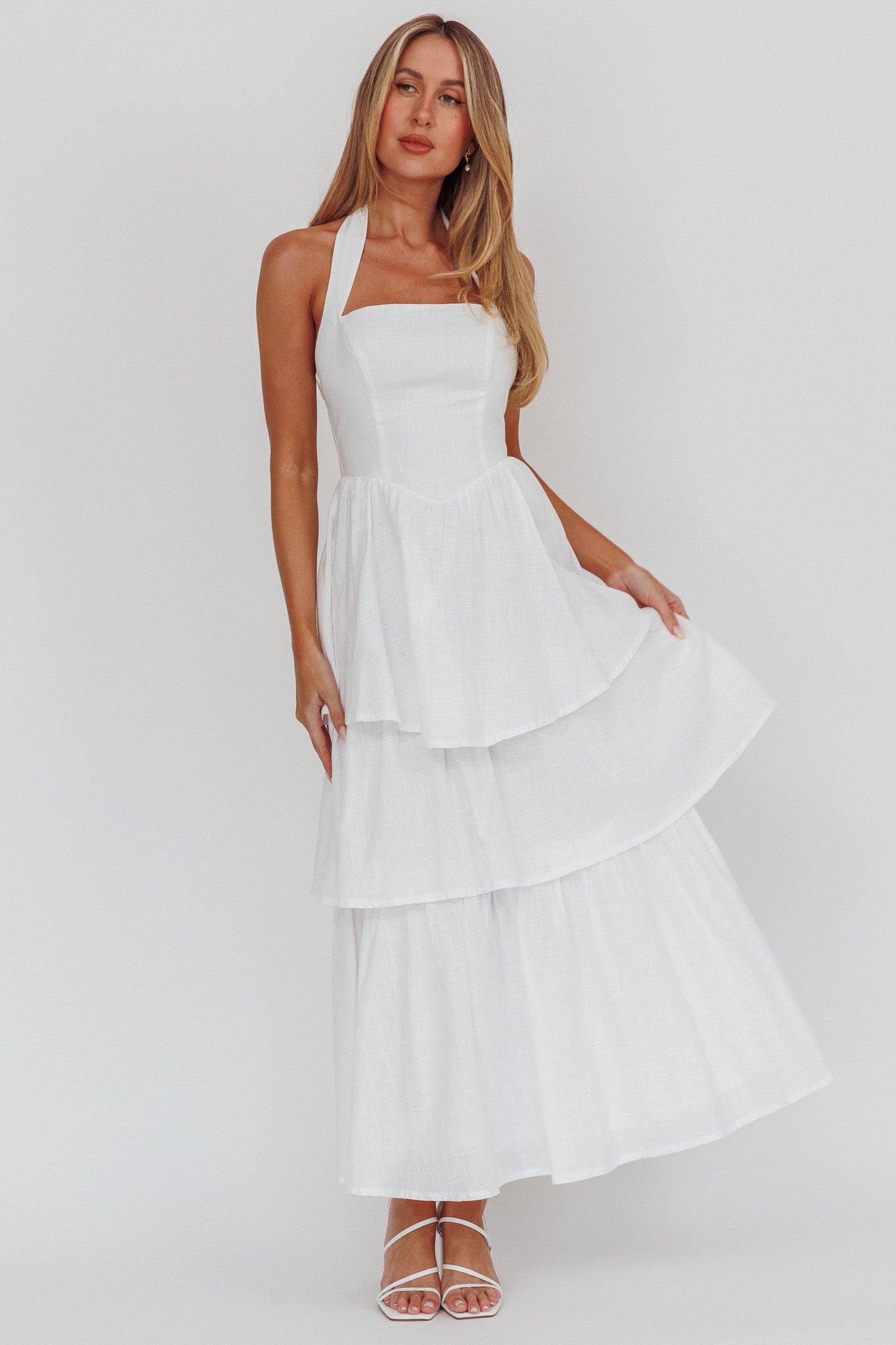 You will steal the spotlight in our gorgeous Shaya maxi dress. It features a halter neckline and a tiered ruffle design in the skirt. It's perfect for sunset cocktails with your girls teamed with strappy, nude heels and a purse for a head-turning look.
