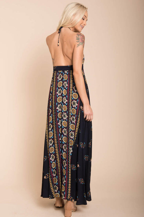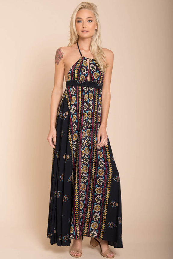 For both beaches and brunches, this maxi has got you covered! Harmonious halter neckline with keyhole slit at bust. Pair with comfy flats and a denim jacket to fight the breeze.