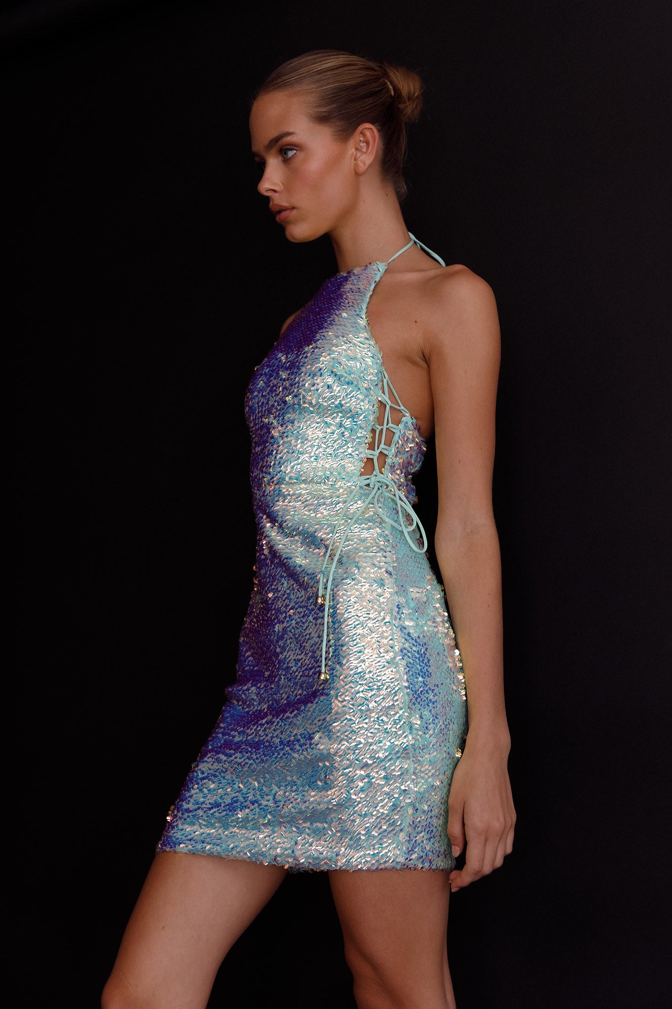 Steal the show in our super hot She's Electric mini dress. We are obsessed with its iridescent sequins and lace up detail in the sides! Perfect for your next birthday celebration or a glitzy night out on the town. Team it with white platform heels and a clutch for a show stopping look!