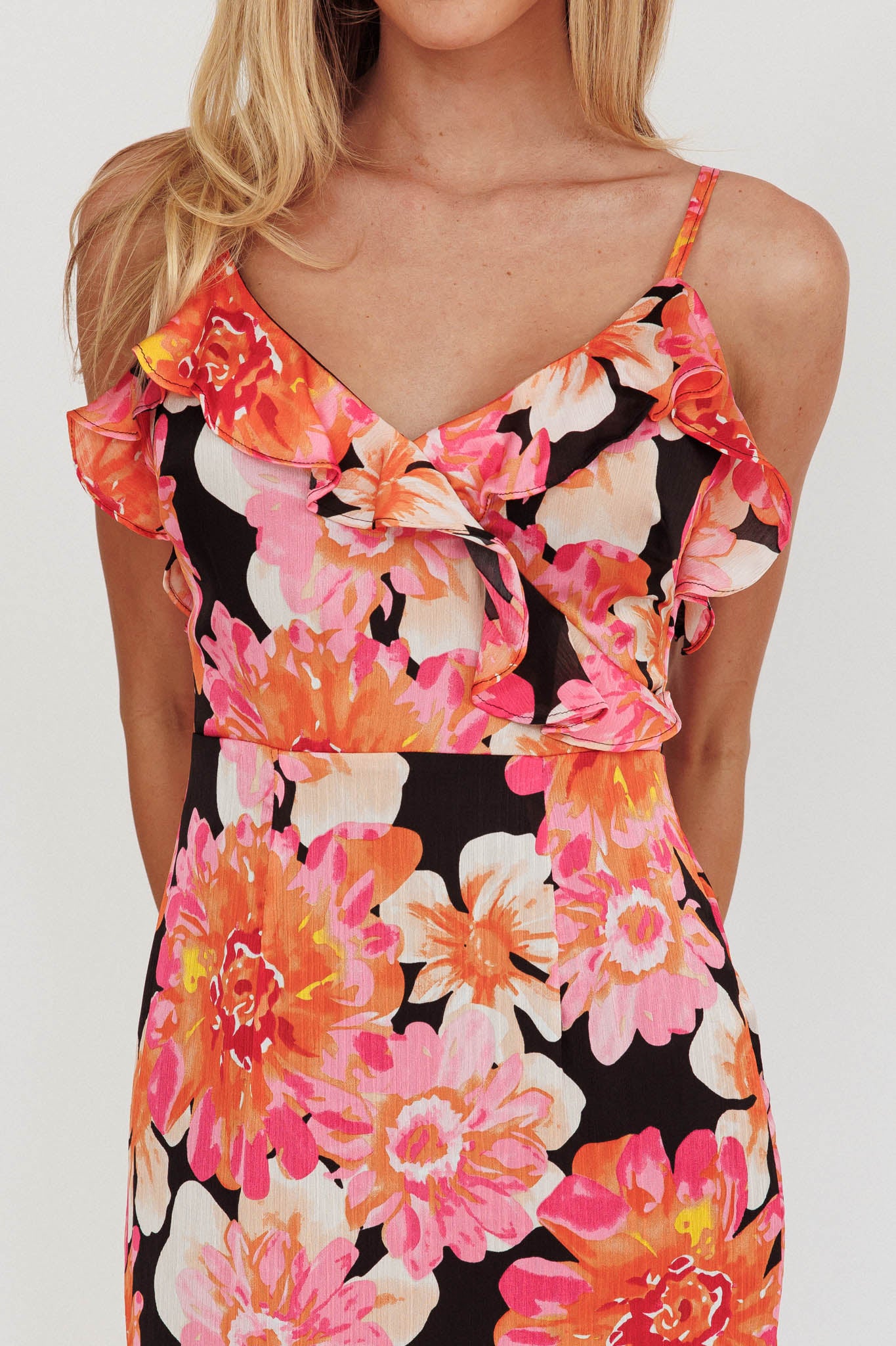 Make heads turn in our pretty Silvana dress. Featuring a pretty floral print and a girly frill trim that wraps around the body, it's perfect for a dinner date with your girls or a special event. Team it with kitten heels and a saddle bag for a look we are loving.