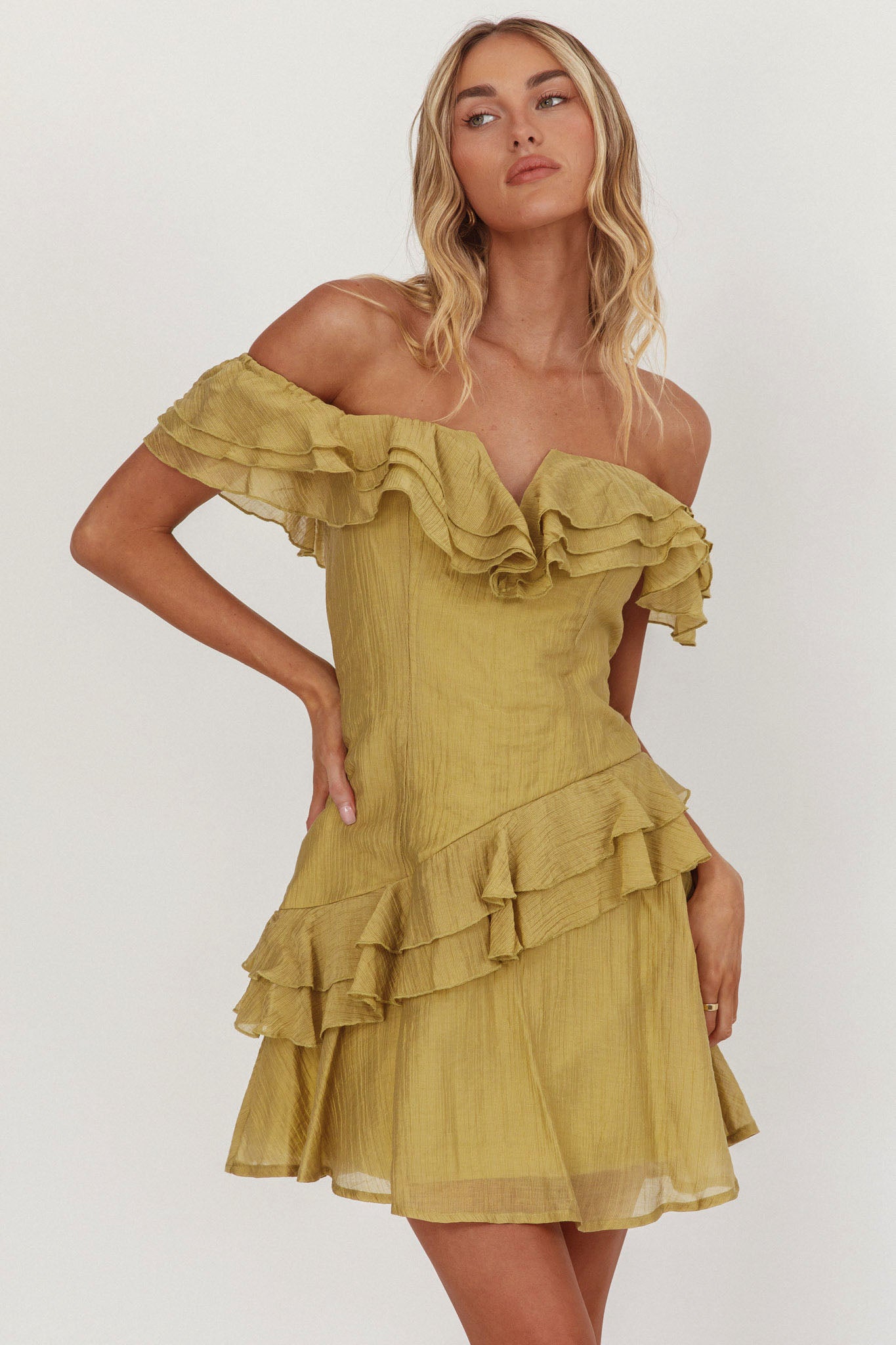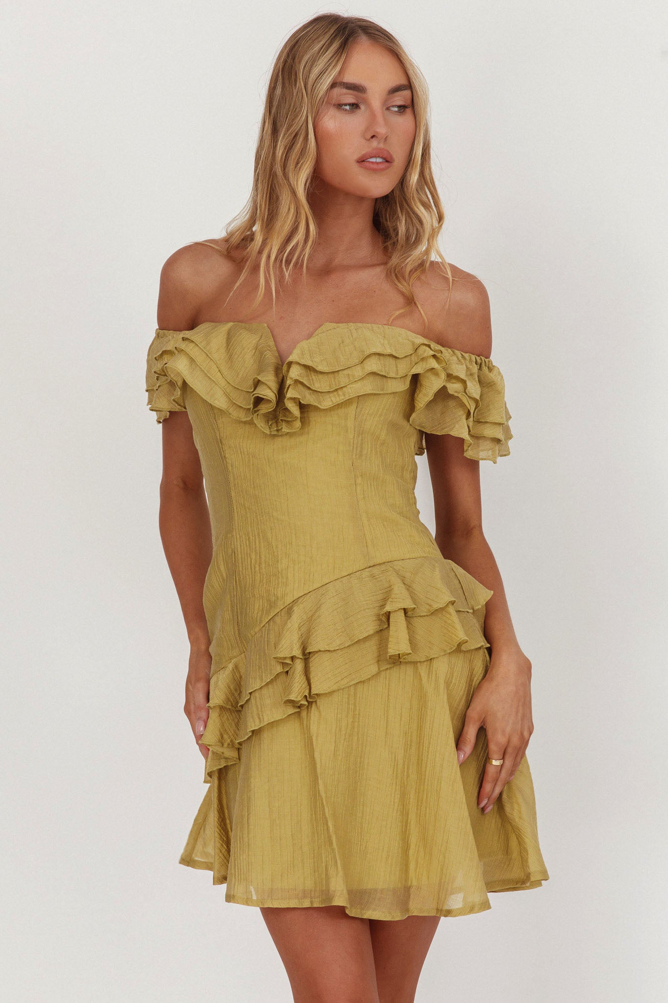 Sinclair Off-Shoulder Ruffle Trim Mini Dress Khaki